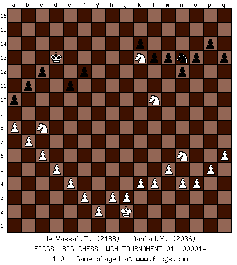 Last move : 1-0 2022 May 10 19:46:49 [Event "FICGS__BIG_CHESS__WCH_TOURNAMENT_01__000014"] [Site "FICGS"] [Date "2021.07.18"] [Round "1"] [White "de Vassal,Thibault"] [Black "Aahlad,Yeturu"] [Result "1-0"] [WhiteElo "2188"] [BlackElo "2036"] 1.j2-k4 h15-g13 2.h2-g4 j15-k13 3.h1-o7 m15-m13 4.e2-e4 p16-o14 5.f1-b5 h16-k14 6.b1-c3 e15-e13 7.m2-m4 b16-c14 8.l1-p5 k16-h15 9.p1-o3 f16-b12 10.g1-j2 d15-d14 11.m1-m3 l16-p12 12.k1-h2 c16-l8 13.m3-l3 n15-n14 14.d2-d3 o16-h10 15.n2-n3 e13-e12 16.o7-l10 k14-l13 17.l10-j8 l8-k7 18.j8-j7 l13-k12 19.c1-h6 e16-e13 20.e1-e3 a15-a13 21.e3-f3 g13-f11 22.f3-f5 e13-j13 23.j7-k6 g16-j15 24.h6-b12 a13-b12 25.p5-q6 h10-g9 26.k6-e6 k12-o12 27.q6-j13 h15-j13 28.e6-h6 o12-o10 29.m4-m5 f15-f13 30.j2-h4 j16-h15 31.o1-j6 k7-j8 32.f5-g5 j15-h13 33.j6-p12 o14-p12 34.b5-k13 j14-k13 35.h6-h13 m16-f16 36.h13-m9 p12-n11 37.m9-j9 j8-l10 38.j1-j2 o15-o14 39.q2-q4 l15-l14 40.l3-l6 a16-a9 41.l6-h6 q16-j16 42.h6-j6 f16-a16 43.j9-g11 l10-m9 44.j6-j9 a16-a11 45.j9-j5 f11-d10 46.g11-p3 n11-p12 47.h2-f3 g9-h10 48.p3-p4 g15-g14 49.q1-o1 a11-p11 50.o3-p5 j16-a16 51.o2-o4 a9-b9 52.g5-b5 b9-a9 53.p2-p3 a16-a10 54.n3-n4 q15-q13 55.o1-o3 m9-j12 56.b5-d5 j12-h11 57.p4-q5 p15-p14 58.o3-l3 h11-j12 59.q5-p4 j12-h11 60.p4-q5 h11-j12 61.q5-q7 c14-e13 62.j5-j12 a9-a7 63.j12-j7 a7-a8 64.q7-m7 e13-c12 65.j7-j10 o10-n9 66.j10-h10 p11-p8 67.m7-m10 n9-m10 68.h10-m10 n14-n13 69.l3-l10 a10-a9 70.l10-d10 c12-d10 71.d5-d10 j13-g12 72.d10-b10 c15-c13 73.m10-c10 g12-e13 74.a2-a4 e13-d11 75.b10-b6 b15-b14 76.a1-a3 d14-d13 77.a3-b3 d11-e9 78.c10-j10 p8-j8 79.j10-j8 a8-j8 80.b6-b9 a9-b9 81.b3-b9 e9-c10 82.c3-b5 d13-d12 83.b9-b7 n13-n12 84.b7-a7 c10-a11 85.b2-b3 o14-o13 86.d3-d4 p12-n13 87.a7-p7 h15-h16 88.c2-c4 h16-h15 89.k4-l6 a11-c12 90.g4-h6 j8-j11 91.p5-n6 h15-h16 92.f3-e5 h16-h15 93.f2-f3 h15-h16 94.h6-f7 h16-h15 95.f7-d8 h15-h16 96.e5-c6 h16-h15 97.b5-a7 h15-h16 98.b3-b4 h16-h15 99.a4-a5 h15-h16 100.b4-b5 h16-h15 101.a5-a6 h15-h16 102.c4-c5 h16-h15 103.b5-b6 h15-h16 104.a7-b9 h16-h15 105.a6-a7 h15-h16 106.c6-e7 h16-h15 107.d4-d5 h15-h16 108.c5-c6 h16-h15 109.b6-b7 h15-h16 110.a7-a8 h16-h15 111.p3-p4 h15-h16 112.q4-q5 h16-h15 113.p4-p5 h15-h16 114.k2-k3 h16-h15 115.q5-q6 h15-h16 116.p7-p10 e12-e11 117.p10-a10 c12-a13 118.e7-c8 b12-b11 119.a10-a12 j11-j10 120.l6-k8 j10-h10 121.l2-l4 h16-h15 122.k3-k4 h15-h16 123.h4-f5 h16-h15 124.f5-e7 h15-h16 125.e7-d9 h16-g15 126.d9-b10 g15-f14 127.b10-c12 h10-a10 128.a12-a10 b11-a10 129.b9-a11 a13-c12 130.a11-c12 b14-b13 131.c12-a11 b13-b12 132.a11-c10 b12-b11 133.c10-e9 f14-e14 134.e9-d11 e14-d14 135.d8-e10 c13-c12 136.d11-f12 g14-g13 137.e10-d12 g13-f12 138.d12-f13 d14-d13 139.f13-h14 k15-k14 140.k8-l10 l14-l13 141.h14-k13 1-0 Follow this game move after move (download)I love all positions. Give me a difficult positional game, I will play it. But totally won positions, I cannot stand them. (Hein Donner) Ich trinke, ich rauche, ich spiele, ich liebe Frauen aber Fernschach ist ein Laster, das ich nicht habe. (Mikhail Nekhemyevich Tal) El Ajedrez es una manera fabulosa para que los niños aprendan a autovalorarse y a autoestimarse. (Saudin Robovic) Les échecs c'est le défi de l'alpiniste, toujours plus haut, prêt à tout pour monter à l'assaut du Roi ennemi. Les échecs, c'est de la musique en mouvement, un ballet majestueux pour les yeux. C'est de la poésie composée par les fantômes du passé qui au même titre que Rimbaud ou Verlaine méritent notre admiration. Les échecs, c'est de la peinture ou le moindre mouvement modifie le tableau pour en faire un Picasso ou un Van Gogh. Les échecs, c'est tout et rien, c'est la vie et la mort. Jjulie33 sur le forum de France-Echecs. When you don't know what to do, walk fast and look worried. (Anonymous)