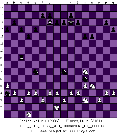 Last move : 0-1 2022 February 4 21:48:29 [Event "FICGS__BIG_CHESS__WCH_TOURNAMENT_01__000014"] [Site "FICGS"] [Date "2021.07.18"] [Round "1"] [White "Aahlad,Yeturu"] [Black "Flores,Luis"] [Result "0-1"] [WhiteElo "2036"] [BlackElo "2181"] 1.j2-k4 j15-k13 2.h1-o7 h15-g13 3.o7-o15 m15-m13 4.o15-o9 p16-o14 5.e2-e4 e15-e13 6.m2-m4 p15-p14 7.d2-d4 o16-p15 8.o9-j9 h16-o10 9.h2-g4 f16-c13 10.p1-o3 b16-c14 11.g1-f3 d15-d13 12.l1-p5 k16-h15 13.n2-n3 l16-p12 14.o1-f9 g16-j15 15.f1-b5 l15-l14 16.k1-h2 m16-n16 17.p5-k10 m13-m12 18.c1-l9 n15-n13 19.l9-m8 o10-p10 20.q1-p1 q16-o16 21.b1-c3 c16-l8 22.f3-e5 o14-m13 23.j9-p3 p10-o11 24.p1-o1 m13-l11 25.o3-n5 n13-n12 26.o2-o3 l11-m9 27.k10-j9 m9-o8 28.m4-m5 c13-n3 29.o1-n1 n3-b14 30.n1-n4 o11-m9 31.m8-l7 k13-l11 32.n5-l6 m9-g14 33.l7-k8 q15-q13 34.e1-e3 j15-k13 35.c3-d5 o8-m7 36.k8-f4 j16-j15 37.e3-a3 m7-l5 38.n4-n7 l5-k7 39.j9-f6 e16-e14 40.m1-n1 g14-l10 41.a1-e1 o16-o10 42.j1-j2 e14-f14 43.p3-p8 n16-o16 44.n7-l7 b14-k6 45.l7-n7 o10-o8 46.p8-p7 k6-l5 47.n7-n9 l10-o7 48.p7-o7 o8-o7 49.l6-n5 o7-o9 50.n5-p4 l5-k6 51.n9-o9 o16-o9 52.h3-h4 p15-o16 53.a3-a6 o16-g9 54.h2-j4 k6-j7 55.f4-j7 g9-j7 56.k4-l6 k7-h8 57.g4-j5 h8-f9 58.l6-j7 l8-g12 59.a6-a9 a16-o16 60.j5-l6 f9-e11 61.n1-n9 o9-n9 62.a9-n9 o16-o10 63.e1-n1 d13-d12 64.j4-h6 g12-h11 65.n9-b9 b15-b14 66.a2-a4 a15-a13 67.b2-b4 c14-b12 68.b5-h11 g13-h11 69.f2-f3 p12-n14 70.f6-e7 n14-e6 71.j2-h2 e6-b9 72.n1-n9 f14-f9 73.n9-n8 f9-p9 74.l2-l4 j15-k14 75.l6-n5 b9-g14 76.n8-c8 c15-c13 77.e5-g6 h15-g13 78.e7-h10 o10-h10 79.h6-k5 h10-c10 80.c8-c10 e11-c10 81.k2-k4 c10-d8 82.g6-e7 p9-c9 83.c2-c3 b12-a10 84.j7-g8 g13-f11 85.q2-q4 a10-b8 86.p4-o6 d8-c6 87.e7-g6 h11-j9 88.g8-j7 k13-j11 89.k5-l7 j9-k7 90.l7-n8 j11-k9 91.j7-l6 k9-m8 92.l6-j7 k7-l9 93.n8-l7 l11-k9 94.j7-k9 m8-k9 95.l7-n6 k9-m10 96.p2-p4 l9-n8 97.o6-m7 n8-m6 98.n6-l5 m10-l8 99.g6-j5 b8-d7 100.g2-g4 f11-h10 101.l5-m3 h10-g8 102.j5-g6 l8-j7 103.g6-j7 g8-j7 104.d5-e3 c6-e7 105.e3-d1 d7-b6 106.a4-a5 b6-a4 0-1 Follow this game move after move (download)I like the moment when I break a man's ego. (Bobby Fischer) Jeder weiß, dass Gasprom Putins persönliches Machtinstrument ist. Die Firma wird vom Kreml aus geleitet und wird schon deshalb nie transparent sein. (Garry Kasparov) El Ajedrez, como cualquier otra actividad creativa, puede existir solo a través de méritos combinados de aquellos que tienen talento creativo y de aquellos que tienen la habilidad de organizar un trabajo creativo. (Mikhail Botvinnik) Les échecs sont plus proches de l'art de l'assassinat que de l'art de la guerre. (Arturo Perez-Reverte) Philosophers use a language that is already deformed as though by shoes that are too tight. (Ludwig Wittgenstein)