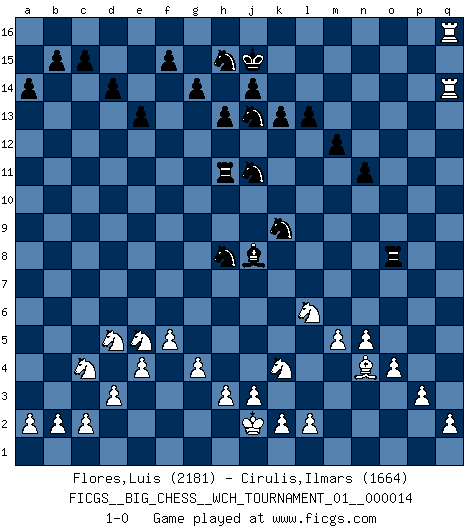 Last move : 1-0 2021 November 4 17:24:25 [Event "FICGS__BIG_CHESS__WCH_TOURNAMENT_01__000014"] [Site "FICGS"] [Date "2021.07.18"] [Round "1"] [White "Flores,Luis"] [Black "Cirulis,Ilmars"] [Result "1-0"] [WhiteElo "2181"] [BlackElo "1664"] 1.j2-k4 n15-n13 2.h1-o7 g15-g14 3.o7-o15 h16-c11 4.b1-c3 d15-d14 5.h2-g4 c11-a9 6.k1-h2 a9-j9 7.o15-f7 g16-f14 8.e2-e4 c16-j10 9.f7-c7 o16-h10 10.m2-m4 h14-h13 11.p1-o3 f16-j13 12.c7-e5 j9-e5 13.g4-e5 p16-n15 14.f1-c4 j10-c4 15.e5-c4 q16-o16 16.d2-d3 o16-o8 17.l1-p5 m15-m14 18.c1-l9 n15-l14 19.n2-n4 l16-n14 20.a1-d1 n14-h9 21.o1-m3 l14-k12 22.f2-f4 b16-c14 23.g1-f3 k12-j10 24.l9-n7 o8-b8 25.f3-e5 m16-o16 26.c3-d5 o16-o9 27.e1-e3 e16-h16 28.e3-g3 a16-g16 29.j1-j2 f14-g12 30.g3-g6 b8-l8 31.h2-j4 j10-h8 32.g6-o6 o9-o6 33.n7-o6 k16-l14 34.o6-n5 j13-n9 35.n5-h10 g12-h10 36.m4-m5 l14-k12 37.o3-n5 k12-j10 38.n5-l6 h8-k9 39.n4-n5 l8-p8 40.o2-o4 p8-p11 41.m3-n4 n9-l7 42.m1-m3 p11-g11 43.g2-g4 l7-j9 44.m3-q3 q15-q14 45.q3-q9 j10-h8 46.q9-p9 n13-n12 47.d1-m1 l15-l13 48.m1-m3 j15-k13 49.m3-q3 k13-j11 50.j4-k6 j9-m12 51.p9-p12 n12-n11 52.q3-q10 m12-n13 53.q10-p10 h9-k7 54.p12-f12 c14-e13 55.f12-a12 a15-a14 56.a12-a10 e13-g12 57.q1-m1 j16-j15 58.m1-m3 e15-e13 59.m3-q3 g11-h11 60.q3-q7 k15-k13 61.a10-a7 k7-g10 62.p5-k10 n13-k10 63.p10-k10 h16-o16 64.p2-p3 o16-o8 65.k10-p10 g16-p16 66.q7-q14 p15-q14 67.p10-p16 m14-m13 68.a7-q7 g12-j13 69.q7-q14 h10-j8 70.k6-j8 g10-j8 71.f4-f5 m13-m12 72.p16-q16 1-0 Follow this game move after move (download)If your opponent offers you a draw, try to work out why he thinks he's worse off. (Nigel Short) Ich habe die Schachforschung dermaßen betrieben, dass sie auf eine wissenschaftliche Basis gestellt wurde. (Mikhail Moiseyevich Botvinik) No hay precio que sea tan grande por la cabellera del Rey enemigo. (Koblentz) A chaque perte on perd un peu de soi. (Joël Lautier) I don't diet. I just don't eat as much as I'd like to. (Linda Evangelista, supermodel)