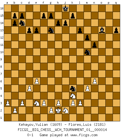 Last move : 0-1 2022 February 22 11:50:39 [Event "FICGS__BIG_CHESS__WCH_TOURNAMENT_01__000014"] [Site "FICGS"] [Date "2021.07.18"] [Round "1"] [White "Kehayov,Yulian"] [Black "Flores,Luis"] [Result "0-1"] [WhiteElo "1609"] [BlackElo "2181"] 1.j2-k4 h15-g13 2.h2-g4 j15-k13 3.h1-o7 m15-m13 4.m2-m4 p16-o14 5.n2-n4 e15-e13 6.e2-e4 b16-c14 7.d2-d4 h16-m12 8.c2-c3 f16-b12 9.g1-j2 l16-p12 10.k1-h2 n15-n13 11.o2-o3 d15-d13 12.l1-p5 k16-h15 13.f1-b5 g16-j15 14.c1-l9 c16-e14 15.o1-f9 o16-f8 16.m4-m5 q16-n16 17.p1-n2 m12-l12 18.b1-d2 e14-j10 19.e4-e5 n13-n12 20.e1-e4 n16-n13 21.m1-m4 n13-o13 22.o7-n7 j10-g8 23.f9-d7 g8-n2 24.q1-n1 n2-g8 25.g4-f6 g8-c12 26.d7-f9 c12-f9 27.b5-f9 l12-f12 28.f9-k13 j15-k13 29.d2-c4 f8-h6 30.l9-h6 b12-h6 31.n7-h7 h6-a13 32.h2-g4 e16-e14 33.p5-n7 e14-f14 34.j1-h2 m16-m14 35.m4-l4 f12-q2 36.n1-p1 a13-b14 37.p1-o1 q2-p2 38.n7-l5 p2-q3 39.l5-b14 a15-b14 40.h7-p7 q3-k9 41.p7-h7 k9-h7 42.f6-h7 q15-q13 43.e5-e6 f14-f9 44.f2-f3 f9-o9 45.g4-j5 o9-o3 46.o1-o3 o13-o3 47.n4-n5 n12-n11 48.n5-n6 o14-n12 49.h7-k8 m14-o14 50.e4-e1 n12-m10 51.j5-h7 a16-a9 52.l4-m4 a9-o9 53.m4-m1 o9-p9 54.m1-p1 p9-p1 55.e1-p1 p15-p14 56.c4-e3 m10-n8 57.a1-n1 n8-m6 58.l2-l3 o3-o2 59.n1-k1 h15-j13 60.d4-d5 j13-k11 61.h7-g9 o14-o9 62.g9-j10 o9-a9 63.a2-a3 a9-q9 64.j10-k12 l15-l14 65.k12-m11 q9-q2 66.h2-j1 m6-l4 67.k2-k3 l4-j3 68.k1-o1 k13-m14 69.o1-o2 q2-o2 70.m11-n13 p12-n14 71.k8-l10 m13-m12 72.l10-n9 k11-m10 73.n9-l10 l14-l13 74.j1-h2 j3-k5 75.n13-p14 o15-p14 76.p1-p14 n14-o13 77.p14-m14 o13-l10 78.m14-m13 o2-o13 79.m13-o13 l10-o13 0-1 This big chess game has been lost on time (started : 2021.07.18 12:8:16) Follow this game move after move (download)Chess is war over the board. The object is to crush the opponents mind. (Bobby Fischer) Der vorletzte Fehler gewinnt. (Savielly Grigorievitsch Tartakower) TodavÃa soy una vÃctima del Ajedrez. Tiene toda la belleza del arte y mucho mas. No puede ser comercializado. El Ajedrez es mas puro que el arte en su posición social. (Marcel Duchamp) Le joueur d'Echecs qui veut atteindre le top est obligé de développer son propre credo créatif. Alexeï Stepanovicth Souétine. Il est facile d'écrire des livres ! Ce qui est difficile, c'est de jouer ! (Alexeï Stepanovicth Souétine) Empty your mind, be formless, shapeless — like water. (Bruce Lee)