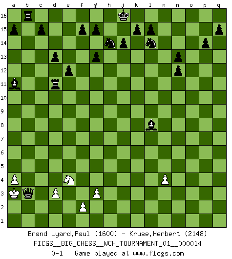 Last move : 0-1 2021 July 24 22:35:1 [Event "FICGS__BIG_CHESS__WCH_TOURNAMENT_01__000014"] [Site "FICGS"] [Date "2021.07.18"] [Round "1"] [White "Brand Lyard,Paul"] [Black "Kruse,Herbert"] [Result "0-1"] [WhiteElo "1600"] [BlackElo "2148"] 1.j2-k4 m15-m13 2.h1-o7 h15-g13 3.o7-o15 p16-o14 4.d2-d3 j15-k13 5.c1-o12 k13-m14 6.o12-m14 m16-m14 7.m2-m4 l16-n14 8.o15-n14 m14-n14 9.l1-p5 h16-o10 10.g2-g3 e15-e13 11.p5-g13 h14-g13 12.o2-o3 f16-b12 13.n2-n4 n14-l14 14.l2-l3 n15-n13 15.o1-d11 e13-e12 16.d11-c12 g16-h14 17.h3-h4 o10-c10 18.c12-f9 c10-m1 19.f9-l14 k16-l14 20.f1-n8 d15-d13 21.g1-h3 m1-o1 22.p2-p4 o1-p2 23.p1-n2 p2-q1 24.j1-j2 q1-o3 25.n2-l1 o3-n4 26.n8-m7 c16-m7 27.j3-j4 o16-f8 28.b1-c3 o14-n12 29.l1-k3 n4-p4 30.k1-m2 p4-n6 31.e1-p1 p15-p14 32.p1-p12 q16-o16 33.p12-n12 m13-n12 34.a1-p1 o16-o2 35.p1-p9 o2-m2 36.j2-j3 m2-q2 37.h3-g5 n6-n7 38.p9-b9 f8-k4 39.l3-k4 n7-k4 40.j3-h3 q2-k2 41.h3-g4 m7-l8 42.h4-h5 b12-a11 43.c3-e4 k2-h2 44.k3-h2 k4-h2 45.b9-b15 h2-j2 46.g5-h3 j2-j4 47.g4-f3 j4-h3 48.b15-b16 a16-b16 49.b2-b3 h3-h5 50.f3-e3 h5-e2 51.e3-d4 b16-b11 52.a2-a4 b11-d11 53.d4-c4 e2-c2 54.c4-b4 e16-b16 55.b4-a3 c2-b3 0-1 Follow this game move after move (download)Every Chess master was once a beginner. (Chernev) Mein erstes Ziel war nicht, die Partie zu gewinnen, sondern eine Figur zu opfern. -- der junge (Wilhelm Steinitz) Fischer era un maestro de claridad y un Rey del posicionamiento astuto. Sus oponentes podían ver hacia donde se dirigía pero eran impotentes para detenerlo. (Bruce Pandolfini) Le thème de l'attaque double intervient d'une manière ou d'une autre dans l'immense majorité des combinaisons. (Youri Averbakh) The hypothalamus is one of the most important parts of the brain, involved in many kinds of motivation, among other functions. The hypothalamus controls the 'Four Fs: Fighting, Fleeing, Feeding and Mating. (Unknown author)