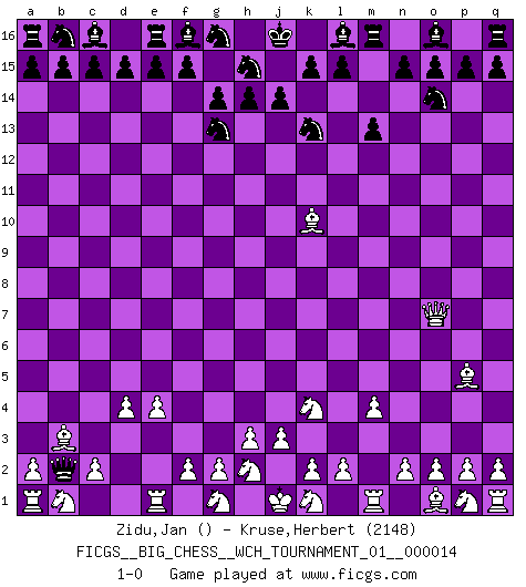 Last move : 1-0 2021 September 7 4:0:4 [Event "FICGS__BIG_CHESS__WCH_TOURNAMENT_01__000014"] [Site "FICGS"] [Date "2021.07.18"] [Round "1"] [White "Zidu,Jan"] [Black "Kruse,Herbert"] [Result "1-0"] [WhiteElo ""] [BlackElo "2148"] 1.j2-k4 m15-m13 2.h1-o7 h15-g13 3.m2-m4 p16-o14 4.d2-d4 j15-k13 5.l1-p5 k16-h15 6.c1-l9 g15-g14 7.e2-e4 h16-m12 8.l9-k10 m12-b12 9.f1-c4 b12-b2 10.c4-b3 1-0 Follow this game move after move (download)Kasparov : J'adoube , Ivanchuk : S'il vous plaît ! (Garry Kasparov & Vassily Ivanchuk, Linares 1997) Ich würde die 30 stärksten Spieler der USA im Simultanspiel besiegen. (José Raúl Capablanca) Combinaciones deslumbrantes son para la mayorÃa, mover madera es para los pocos. (Georg Kieninger) Les échecs c'est le défi de l'alpiniste, toujours plus haut, prêt à tout pour monter à l'assaut du Roi ennemi. Les échecs, c'est de la musique en mouvement, un ballet majestueux pour les yeux. C'est de la poésie composée par les fantômes du passé qui au même titre que Rimbaud ou Verlaine méritent notre admiration. Les échecs, c'est de la peinture ou le moindre mouvement modifie le tableau pour en faire un Picasso ou un Van Gogh. Les échecs, c'est tout et rien, c'est la vie et la mort. Jjulie33 sur le forum de France-Echecs. Treat your password like your toothbrush. Don't let anybody else use it, and get a new one every six months. (Clifford Stoll)