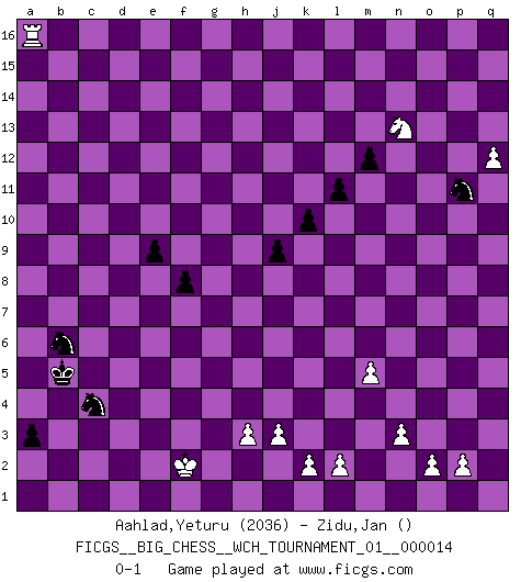 Last move : 0-1 2022 November 14 20:37:21 [Event "FICGS__BIG_CHESS__WCH_TOURNAMENT_01__000014"] [Site "FICGS"] [Date "2021.07.18"] [Round "1"] [White "Aahlad,Yeturu"] [Black "Zidu,Jan"] [Result "0-1"] [WhiteElo "2036"] [BlackElo ""] 1.j2-k4 m15-m13 2.e2-e4 j15-k13 3.h1-o7 h15-g13 4.m2-m4 e15-e13 5.f1-b5 h16-k14 6.h2-g4 n15-n13 7.d2-d3 d15-d13 8.b1-c3 l16-p12 9.l1-p5 k16-h15 10.c1-l9 c16-e14 11.e4-e5 b16-d15 12.e1-e4 f16-b12 13.g1-j2 p16-o14 14.a1-e1 o16-f8 15.g4-f6 g16-j15 16.n2-n3 f15-f14 17.e4-c4 c15-c14 18.e1-e4 k14-g11 19.g2-g3 e14-l8 20.o1-f9 m16-m14 21.p1-o3 g11-o11 22.o7-o11 p12-o11 23.k4-l6 q16-m16 24.m4-m5 m13-m12 25.f9-g8 o11-m13 26.g8-m13 m14-m13 27.c4-c8 l8-g12 28.c8-b8 d15-b14 29.b5-c4 m13-m15 30.m1-m4 b12-d10 31.b8-d8 d10-e9 32.d8-d11 f8-h6 33.d11-p11 h6-l9 34.p5-l9 o14-n16 35.m4-o4 o15-o14 36.q1-m1 k13-l11 37.p11-q11 g12-k9 38.e4-h4 e9-g11 39.l9-k8 g11-k8 40.l6-k8 h15-k14 41.j2-k4 k14-m13 42.o4-o9 j15-k13 43.k4-l6 m13-o12 44.q11-q9 k9-n12 45.q9-q10 b14-c12 46.m1-m4 q15-q13 47.k1-l3 p15-p13 48.l3-k5 n16-p15 49.k5-l7 n12-m13 50.c4-b5 p15-o13 51.b5-e8 m13-l12 52.o9-o6 m15-m14 53.a2-a4 e13-e12 54.m4-j4 m14-k14 55.o3-n5 o13-n11 56.c3-d5 j16-h15 57.n5-m7 l11-n10 58.j4-j9 k13-l11 59.h4-h7 m16-m13 60.e8-f7 l12-f7 61.h7-f7 g13-f11 62.f7-f10 e16-e13 63.f6-h7 a16-e16 64.b2-b4 e13-j13 65.j9-b9 b15-b13 66.q10-q4 e16-e13 67.q4-g4 e13-g13 68.f10-g10 g13-g10 69.g4-g10 j13-g13 70.g10-a10 a15-a13 71.c2-c4 m13-h13 72.g3-g4 h13-h10 73.a10-a8 f11-d10 74.b9-j9 n11-l10 75.j9-j8 g13-g7 76.j8-h8 h10-h8 77.a8-h8 l10-k8 78.m7-k8 l11-k9 79.l7-k9 k14-k9 80.q2-q4 d10-f9 81.h8-f8 c12-e11 82.l6-j7 k9-l9 83.j7-l6 l9-l7 84.f8-c8 l7-h7 85.k8-h7 g7-h7 86.j1-j2 e11-c12 87.f2-f4 h7-h8 88.c8-h8 f9-h8 89.l6-j7 l15-l13 90.d5-e7 k15-k13 91.e7-d9 l13-l12 92.j7-g8 n10-l11 93.g8-h10 h8-g10 94.a4-a5 l11-j10 95.a5-a6 f14-f13 96.c4-c5 g15-g13 97.b4-b5 j10-h12 98.d3-d4 h14-h13 99.d4-d5 g13-g12 100.b5-b6 f13-f12 101.a6-a7 f12-f11 102.o6-o8 h15-h14 103.c5-c6 h12-f13 104.b6-b7 g12-g11 105.h10-k9 l12-l11 106.a7-a8 k13-k12 107.d5-d6 j14-j13 108.c6-c7 j13-j12 109.b7-b8 h13-h12 110.a8-a9 j12-j11 111.f4-f5 h12-h11 112.e5-e6 h14-h13 113.d6-d7 k12-k11 114.k9-l7 g10-h12 115.o8-o10 k11-k10 116.c7-c8 h12-k11 117.l7-n8 j11-j10 118.b8-b9 h11-h10 119.a9-a10 e12-e11 120.o10-o9 j10-j9 121.c8-c9 h13-g12 122.d7-d8 d13-d12 123.b9-b10 e11-e10 124.d9-c7 c12-e11 125.a10-a11 e11-f9 126.c7-b9 f13-e11 127.f5-f6 g12-f12 128.e6-e7 e11-c12 129.g4-g5 f12-e11 130.e7-e8 f9-h8 131.b10-b11 c12-e13 132.c9-c10 f11-f10 133.o9-o6 e13-f11 134.o6-o7 f11-d10 135.b9-d10 e11-d10 136.o7-c7 k11-h12 137.e8-e9 d10-c11 138.e9-f10 g11-f10 139.c7-e7 c11-d10 140.d8-d9 e10-e9 141.g5-g6 f10-f9 142.g6-g7 h8-g10 143.e7-f7 g10-e11 144.g7-g8 f9-f8 145.f7-h7 h12-f11 146.g8-g9 e11-g12 147.g9-h10 g12-h10 148.h7-h5 d10-d9 149.h5-g5 f11-e13 150.g5-d5 d9-c10 151.d5-d12 c10-b11 152.d12-d14 b11-a11 153.d14-o14 h10-g8 154.o14-e14 e13-c12 155.f6-f7 g8-h6 156.e14-c14 h6-f7 157.c14-c13 o12-m11 158.c13-b13 a13-a12 159.b13-b16 c12-d10 160.b16-p16 p13-p12 161.p16-p13 f7-d6 162.p13-q13 a11-b10 163.q13-p13 a12-a11 164.p13-p12 a11-a10 165.p12-p11 m11-o12 166.n8-o10 a10-a9 167.o10-m11 o12-n10 168.p11-p6 d10-c8 169.m11-n13 a9-a8 170.q4-q5 a8-a7 171.q5-q6 a7-a6 172.p6-p16 a6-a5 173.p16-a16 d6-c4 174.q6-q7 b10-c9 175.q7-q8 c8-b6 176.q8-q9 a5-a4 177.q9-q10 a4-a3 178.q10-q11 c9-b8 179.q11-q12 n10-p11 180.j2-h2 b8-b7 181.h2-g3 b7-c6 182.g3-f2 c6-b5 0-1 Follow this game move after move (download)Pawn endings are to Chess what putting is to golf. (Cecil Purdy) Sicherlich können nur Meister einen Stil haben. Daß ein nicht-Meister auch nur ein einziges Mal in seinem Leben eine Partie folgerecht durchführte, habe ich niemals bemerkt. (Emanuel Lasker) Un entendimiento minucioso de las típicas continuaciones de mate hacen de las mas complicadas combinaciones de sacrificio que conducen hacia ellas no solo no dificiles, sino casi un asunto de rutina. (Siegbert Tarrasch) Je ne crois pas en la psychologie, je crois aux bons coups. (Robert Fischer) If you don't practice you don't deserve to win. (Andre Agassi)