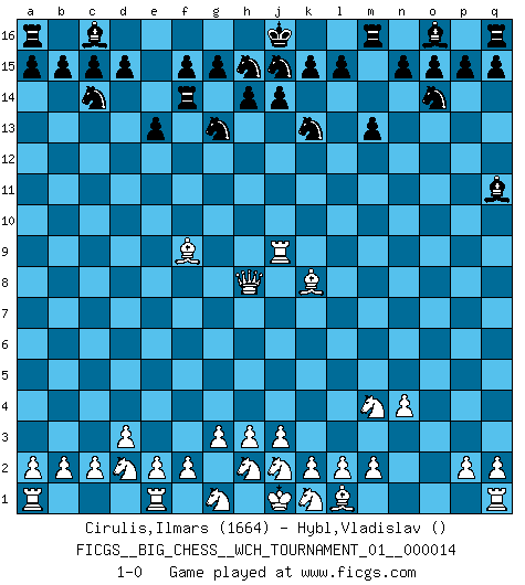 Last move : 1-0 2021 October 13 11:23:8 [Event "FICGS__BIG_CHESS__WCH_TOURNAMENT_01__000014"] [Site "FICGS"] [Date "2021.07.18"] [Round "1"] [White "Cirulis,Ilmars"] [Black "Hybl,Vladislav"] [Result "1-0"] [WhiteElo "1664"] [BlackElo ""] 1.n2-n4 j15-k13 2.g2-g3 m15-m13 3.h1-f3 h15-g13 4.d2-d3 e15-e13 5.c1-k8 b16-c14 6.f1-g2 f16-c13 7.o1-f9 c13-o2 8.m1-o1 o2-h8 9.f3-a8 h16-h15 10.a8-h8 h15-c10 11.g2-a8 c10-h15 12.a8-h15 k16-h15 13.b1-d2 g16-j15 14.o1-o9 l16-q11 15.o9-n9 e16-e14 16.p1-o3 p16-o14 17.n9-j9 e14-f14 18.o3-m4 1-0 Follow this game move after move (download)I won't play with you anymore. You have insulted my friend. - When an opponent cursed himself for a blunder. (Miguel Najdorf) Karpov ist ein Museumsstück. (Garry Kasparov) Las piezas de Ajedrez son los bloques del alfabeto que moldean los pensamientos; y esos pensamientos, aunque hagan un diseño visual en el tablero, expresan abstractamente su belleza como un poema. (Marcel Duchamp) Même si vous avez un bon coup à faire, regardez toujours s'il n'y en a pas un qui lui soit préférable. (Pedro Damiano) God is an atheist. (Unknown)