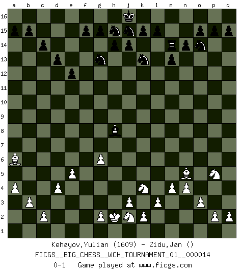 Last move : 0-1 2022 March 3 1:38:21 [Event "FICGS__BIG_CHESS__WCH_TOURNAMENT_01__000014"] [Site "FICGS"] [Date "2021.07.18"] [Round "1"] [White "Kehayov,Yulian"] [Black "Zidu,Jan"] [Result "0-1"] [WhiteElo "1609"] [BlackElo ""] 1.j2-k4 m15-m13 2.h2-g4 j15-k13 3.n2-n4 h16-o10 4.o2-o3 l16-p12 5.k1-h2 e15-e13 6.m2-m4 d15-d13 7.h1-m5 e13-e12 8.d2-d4 c16-l8 9.m5-f5 h15-g13 10.e2-e4 n15-n14 11.l1-p5 k16-h15 12.g1-j2 b16-c14 13.c1-l9 c14-e13 14.p1-q3 e16-e14 15.f1-c4 e14-f14 16.f5-l5 l8-g4 17.h2-g4 p12-g4 18.h3-g4 o10-f2 19.e1-e2 f2-f1 20.j1-h2 f1-m1 21.b2-b3 f14-f1 22.l5-l4 f1-b1 23.a1-b1 m1-b1 24.a2-a4 b1-f1 25.q1-p1 c15-c14 26.o1-m3 f1-f13 27.l4-f9 f13-f9 28.m3-f9 g16-j15 29.e4-e5 f16-c13 30.p1-m1 o16-g9 31.l2-l3 p16-o14 32.g4-g5 g9-j7 33.g5-g6 j7-l9 34.p5-l9 a16-e16 35.e2-e4 e16-e14 36.f9-h7 e14-f14 37.m1-f1 f14-f1 38.c4-f1 m16-m14 39.l9-k8 e13-f11 40.f1-a6 m14-l14 41.e4-f4 l14-l8 42.k8-n5 q16-m16 43.f4-f6 l8-b8 44.f6-f7 f11-g9 45.f7-c7 c13-f10 46.c7-g7 g9-h7 47.g7-h7 b8-h8 48.h7-h8 f10-h8 49.q3-p5 m16-m14 0-1 This big chess game has been lost on time (started : 2021.07.18 12:8:16) Follow this game move after move (download)Fischer Chess play was always razor-sharp, rational and brilliant. One of the best ever. (Dave Regis) Konzentriere dich auf materielle Gewinne. Nimm, was dir dein Gegner gibt, ausser es gibt einen guten Grund der dagegenspricht. (Robert James Fischer) Combinaciones deslumbrantes son para la mayoría, mover madera es para los pocos. (Georg Kieninger) Les échecs sont utiles à l'exercice de la faculté de penser et à celle de l'imagination. Car nous devons posséder une méthode élaborée pour atteindre des buts partout où nous devons conduire notre raison. (Leibnitz) Luck never gives; it only lends. (Swedish proverb)