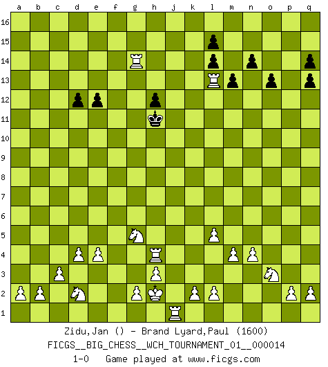 Last move : 1-0 2021 October 9 8:6:8 [Event "FICGS__BIG_CHESS__WCH_TOURNAMENT_01__000014"] [Site "FICGS"] [Date "2021.07.18"] [Round "1"] [White "Zidu,Jan"] [Black "Brand Lyard,Paul"] [Result "1-0"] [WhiteElo ""] [BlackElo "1600"] 1.j2-k4 c15-c14 2.h1-o7 f15-f14 3.o7-e16 j15-k13 4.e16-c16 h16-o10 5.c16-b15 b16-a14 6.b15-a16 o10-f2 7.g1-f3 f2-o10 8.a16-a15 n15-n14 9.a15-a14 o10-o2 10.p1-o3 o2-k6 11.h2-j4 k6-d6 12.k1-h2 e15-e14 13.e2-e4 f16-b12 14.a14-a6 d6-a6 15.f1-a6 h14-h13 16.n2-n4 q15-q13 17.d2-d4 b12-k4 18.j3-k4 o16-b4 19.c2-c3 b4-d6 20.c1-m10 g15-g13 21.m2-m4 d6-h2 22.j1-h2 m15-m13 23.o1-f9 l16-m15 24.b1-d2 k13-h12 25.f9-m15 m16-m15 26.l1-p5 q16-q14 27.m10-q14 p15-q14 28.p5-h12 g13-h12 29.m1-m3 m15-m14 30.m3-j3 m14-l14 31.j4-l5 l14-l5 32.k4-l5 g16-h14 33.a6-h13 h15-k14 34.h13-e16 d15-d13 35.e16-c14 h14-g12 36.c14-d15 e14-e13 37.d15-g12 j16-j15 38.q1-j1 p16-o14 39.f3-g5 o14-n12 40.e1-f1 k14-h13 41.g12-h13 k16-l14 42.h13-j14 n12-l13 43.j14-k13 j15-h14 44.f1-f14 h14-h13 45.k13-l14 k15-l14 46.j3-j13 h13-g12 47.j13-l13 d13-d12 48.a1-f1 g12-h11 49.f14-g14 o15-o13 50.f1-f4 e13-e12 51.f4-h4 1-0 Follow this game move after move (download)A thorough understanding of the typical mating continuations makes the most complicated sacrificial combinations leading up to them not only not difficult, but almost a matter of course. (Siegbert Tarrasch) Jeder weiß, dass Gasprom Putins persönliches Machtinstrument ist. Die Firma wird vom Kreml aus geleitet und wird schon deshalb nie transparent sein. (Garry Kasparov) Si pudieramos observar el interior de la cabeza de un jugador de Ajedrez, encontraríamos ahí un mundo lleno de sentimientos, imágenes, ideas, emoción y pasión. (Alfred Binet) Ne tendez aucun piège pour le plaisir ! Ne jouez rien dans l'espoir que l'adversaire réagisse de façon stupide ! Prenez toujours pour acquis que l'adversaire va trouver le meilleur coup ! Ne jouez jamais de coup dans l'espoir que l'adversaire ne voie pas la menace ! Chacun de vos coups doit améliorer la position d'une façon ou d'une autre. Somewhere in the world there is an epigram for every dilemma. (Hendrik Willem van Loon)