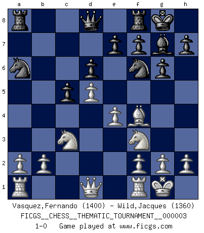 Last move : 1-0 2006 October 5 4:56:22 [Event "FICGS__CHESS__THEMATIC_TOURNAMENT__000003"] [Site "FICGS"] [Date "2006.06.24"] [Round "1"] [White "Vasquez,Fernando"] [Black "Wild,Jacques"] [Result "1-0"] [WhiteElo "1400"] [BlackElo "1360"] 1.d4 Nf6 2.c4 c5 3.d5 b5 4.cxb5 a6 5.bxa6 g6 6.Nc3 Bxa6 7.e4 d6 8.Bxa6 Nxa6 9.Nf3 Bg7 10.O-O O-O 11.Bf4 1-0 Benko gambit accepted Kingside Castling by player White (move 10) Kingside Castling by player Black (move 10) Player White won this chess game. Follow this game move after move (download)The most important feature of the Chess position is the activity of the pieces. This is absolutely fundamental in all phases of the game: Opening, Middlegame and especially Endgame. The primary constraint on a piece's activity is the Pawn structure. (Michael Stean) Die Idee von Capablanca, Schach als Fach in den Schulen zu lehren, ist großartig. (Fidel Castro) En la perfecta combinación de Ajedrez como en una historia corta de primera clase, toda la trama y contra trama deberá conducir hacia un final sorprendente, el interes no es mitigado hasta el último momento. (Yates and Winter) Ce qui est bien, c'est d'avoir tout un tas de pièces en prise : l'adversaire ne peut en prendre qu'une à la fois. Cité par Thierry Audin. Methinks King Thibault should dub Marius Zubac a knight of the square board... I mean table, henceforth addressing him as Sir Marius, and bestow on him a suitable land from the kingdom of FICGS & marry him off to a worthy, fair maiden, lest he slice our heads with his mighty sword in his wrath. (Dinesh De Silva)