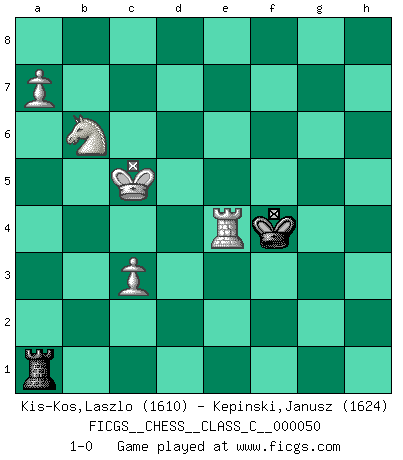 Last move : 1-0 2008 March 24 11:53:28 [Event "FICGS__CHESS__CLASS_C__000050"] [Site "FICGS"] [Date "2007.07.14"] [Round "1"] [White "Kis-Kos,Laszlo"] [Black "Kepinski,Janusz"] [Result "1-0"] [WhiteElo "1610"] [BlackElo "1624"] 1.e4 e6 2.d4 d5 3.Nc3 Nf6 4.Bg5 dxe4 5.Nxe4 Be7 6.Bxf6 gxf6 7.Bc4 b6 8.d5 O-O 9.Qh5 f5 10.Nc3 c6 11.dxe6 fxe6 12.Nf3 b5 13.Bb3 Qe8 14.Qxe8 Rxe8 15.O-O-O Bc5 16.Rhe1 Bxf2 17.Re2 b4 18.Rxf2 bxc3 19.bxc3 Na6 20.g4 fxg4 21.Ne5 h5 22.Rf5 Rf8 23.Rg5+ Kh7 24.Rxh5+ Kg7 25.h3 Rf5 26.hxg4 Rxh5 27.gxh5 Kh6 28.Nxc6 Kxh5 29.Re1 Nc7 30.Kd2 Kg6 31.Rg1+ Kf7 32.Rf1+ Kg7 33.Ne5 Ne8 34.Rf7+ Kh6 35.Rf8 Nc7 36.a4 a6 37.Rg8 Bb7 38.Bxe6 Nxe6 39.Rg6+ Kh5 40.Rxe6 Rd8+ 41.Ke3 Bc8 42.Rb6 Re8 43.Kd4 Bf5 44.Rxa6 Rd8+ 45.Kc4 Rd2 46.Ra8 Be4 47.Rh8+ Kg5 48.a5 Rxc2 49.a6 Rd2 50.a7 Ra2 51.Nf7+ Kf4 52.Nd6 Bg2 53.Rg8 Bh1 54.Rg7 Ba8 55.Kc5 Kf3 56.Nc4 Ra1 57.Nb6 Be4 58.Re7 Kf4 59.Rxe4+ 1-0 French : Burn variation Kingside Castling by player Black (move 8) Queenside Castling by player White (move 15) 10 pieces endgame at move 40 : White KRNPPP , Black KRBP WHITE : King + 1 Rook 1 Knight 3 Pawns BLACK : King + 1 Rook 1 Bishop 1 Pawn 9 pieces endgame at move 44 : White KRNPPP , Black KRB WHITE : King + 1 Rook 1 Knight 3 Pawns BLACK : King + 1 Rook 1 Bishop 8 pieces endgame at move 48 : White KRNPP , Black KRB WHITE : King + 1 Rook 1 Knight 2 Pawns BLACK : King + 1 Rook 1 Bishop 7 pieces endgame at move 59 : White KRNPP , Black KR WHITE : King + 1 Rook 1 Knight 2 Pawns BLACK : King + 1 Rook Player White won this chess game. Follow this game move after move (download)Why must I lose to this idiot ? (Aron Nimzovich) Versuche, dich von der Sklaverei der Eröffnungsvarianten zu befreien. Stattdessen soll man gewisse Typenpositionen erlernen, die man eingehend analysiert. (Aaron Nimzowitsch) Los Peones son el alma de una partida de Ajedrez. (Francois Andre Danican Philidor) Il (Jacob Murray) ne joue pas pour le bon coup, mais pour le meilleur. (Eloi Relange) First of all, we have to go back to the classical time control. (Anatoly Karpov)