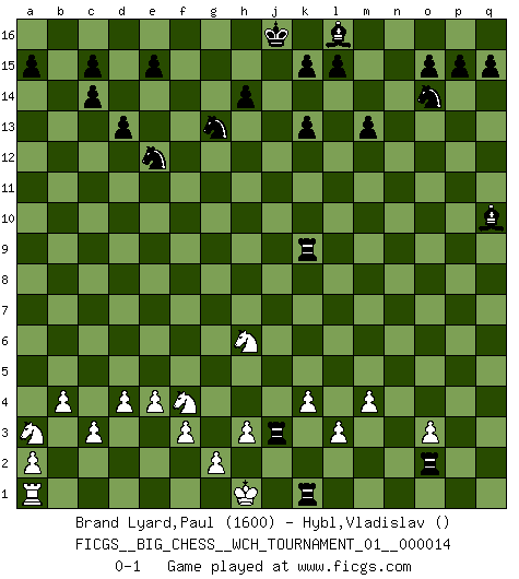 Last move : 0-1 2021 August 21 0:41:45 [Event "FICGS__BIG_CHESS__WCH_TOURNAMENT_01__000014"] [Site "FICGS"] [Date "2021.07.18"] [Round "1"] [White "Brand Lyard,Paul"] [Black "Hybl,Vladislav"] [Result "0-1"] [WhiteElo "1600"] [BlackElo ""] 1.j2-k4 m15-m13 2.h1-o7 h15-g13 3.d2-d3 p16-o14 4.n2-n3 j15-k13 5.c1-l9 k16-h15 6.o1-d11 g15-g14 7.d11-g14 f15-g14 8.o7-g14 g16-f14 9.e2-e4 h16-g15 10.g14-g15 f16-g15 11.l9-g13 h15-g13 12.m2-m4 d15-d13 13.d3-d4 f14-e12 14.n3-n4 n15-n13 15.l1-q6 e16-f16 16.f2-f3 b16-c14 17.f1-a6 f16-f6 18.a6-b5 f6-q6 19.b5-k13 j14-k13 20.e1-e3 o16-f8 21.l2-l3 m16-m14 22.e3-c3 m14-j14 23.c3-c14 b15-c14 24.p1-o3 a16-b16 25.b2-b3 f8-g7 26.c2-c3 g15-c11 27.m1-m3 c16-a14 28.k4-h5 a14-m3 29.q1-m1 m3-n4 30.h5-g7 c11-g7 31.m1-n1 n4-o3 32.p2-o3 q6-q2 33.n1-n13 g7-n13 34.b1-a3 q2-o2 35.h2-g4 b16-b9 36.g1-e2 b9-k9 37.k2-k4 q16-n16 38.b3-b4 n13-q10 39.g4-h6 n16-n1 40.e2-f4 j14-j3 41.j1-h1 n1-k1 0-1 Follow this game move after move (download)Why must I lose to this idiot ? (Aron Nimzovich) Um sich vor der Gefahr einer Erkältung zu schützen, sorge der wanderlustige König beizeiten für ein brauchbares Versteck. (Aaron Nimzowitsch) Solo el jugador con la iniciativa tiene el derecho a atacar. (Wilhelm Steinitz) Des idées, des idées, j'en ai cent, j'en ai mille. Des bonnes, des mauvaises, applicables, irréalisables... Il suffit de faire le tri ! (Roos) If you lose the game you should win the analysis! (Proverb)