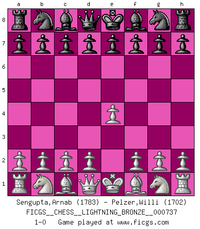 Last move : 1-0 2021 July 19 9:24:50 [Event "FICGS__CHESS__LIGHTNING_BRONZE__000737"] [Site "FICGS"] [Date "2021.07.19"] [Round "1"] [White "Sengupta,Arnab"] [Black "Pelzer,Willi"] [Result "1-0"] [WhiteElo "1783"] [BlackElo "1702"] 1.e4 1-0 This chess game has been lost on time (started : 2021.07.19 8:31:14) King's pawn Opening Player White won this chess game. Follow this game move after move (download)The sign of a great Master is his ability to win a won game quickly and painlessly. (Irving Chernev) Ein Schachgenie ist jemand der verdammt gut Schach spielt. (Jonathan Levitt) En un gambito tu regalas un Peón por el bién de tomar un juego perdido. (Samuel Standige Boden) Les échecs sont un jeu par leur forme, un art par leur essence et une science par sa difficulté d'acquisition. Ils peuvent vous procurer autant de plaisir qu'un bon livre ou une belle musique, mais vous n'aurez une réelle joie que si vous arrivez à bien jouer. (Tigran Petrosian) The man who strikes first admits that his ideas have given out. (Chinese proverb)