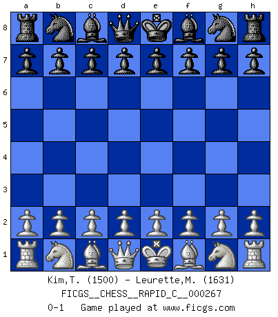 Last move : 0-1 2021 August 21 21:1:57 [Event "FICGS__CHESS__RAPID_C__000267"] [Site "FICGS"] [Date "2021.07.22"] [Round "1"] [White "Kim,Tinemaexo"] [Black "Leurette,Marc-Antoine"] [Result "0-1"] [WhiteElo "1500"] [BlackElo "1631"] 0-1 This chess game has been lost on time (started : 2021.07.22 16:42:47) Player Black won this chess game. Follow this game move after move (download)No other master has such a terrific will to win. At the board he radiates danger, and even the strongest opponents tend to freeze, like rabbits when they smell a panther. Even his weaknesses are dangerous. As white, his opening game is predictable - you can make plans against it - but so strong that your plans almost never work. In the middle game his precision and invention are fabulous, and in the end game you simply cannot beat him. (Anonymous German Expert) Wenn ein Kopf und ein Buch zusammenstoßen und es klingt hohl, ist es denn allemal im Buche? (Georg Christoph Lichtenberg) El Ajedrez es tan inspirador que yo no creo que un buen jugador sea capaz de tener un pensamiento malo durante una partida. (Wilhelm Steinitz) Vous savez, camarade Pachman, je n'éprouve pas de plaisir à être ministre, je jouerais plutôt aux échecs comme vous, ou alors ferais une révolution au Venezuela. (Che Guevara à Ludek Pachman, 'Checkmate in Prague', 1975) Good luck. You're gonna need it. (Han Solo in Star Wars ep.6)