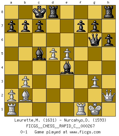 Last move : 0-1 2021 August 20 13:3:22 [Event "FICGS__CHESS__RAPID_C__000267"] [Site "FICGS"] [Date "2021.07.22"] [Round "1"] [White "Leurette,Marc-Antoine"] [Black "Nurcahyo,Dery"] [Result "0-1"] [WhiteElo "1631"] [BlackElo "1593"] 1.e4 e5 2.Nf3 d6 3.Nc3 Nf6 4.Bc4 h6 5.d4 exd4 6.Nxd4 Nbd7 7.O-O Ne5 8.Re1 Nxc4 9.b3 Ne5 10.Nd5 Neg4 11.h3 Ne5 12.Nxf6+ Qxf6 13.c4 Bd7 14.Bb2 Qg6 15.Nf3 Bxh3 16.g3 Ng4 17.Nh2 Nxh2 18.Kxh2 Bg4 19.f3 Qh5+ 20.Kg1 Bxf3 21.Qd2 O-O-O 22.Qh2 Qg6 23.e5 d5 24.Rf1 Be4 25.cxd5 Bc5+ 0-1 Philidor's defense Kingside Castling by player White (move 7) Queenside Castling by player Black (move 21) Player Black won this chess game. Follow this game move after move (download)When you absolutely don't know what to do anymore, it is time to panic. (John van der Wiel) Der Vorposten provoziert a) eine Basis für neue Angriffe und b) eine Schwächung der gegnerischen Widerstandskraft in der fraglichen Linie. (Aaron Nimzowitsch) Yo jugué Ajedrez con el y a veces le pude haber ganado solo que siempre devuelve su última jugada y juega la partida de manera diferente. (Mark Twain) Je ne crois pas en la psychologie, je crois aux bons coups. (Robert Fischer) The ego is not master in its own house. (Sigmund Freud)
