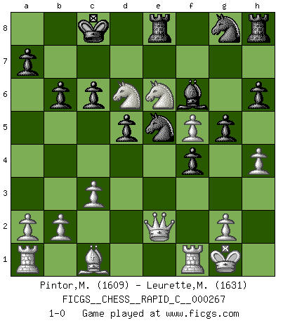 Last move : 1-0 2021 July 29 17:20:2 [Event "FICGS__CHESS__RAPID_C__000267"] [Site "FICGS"] [Date "2021.07.22"] [Round "1"] [White "Pintor,Manuel"] [Black "Leurette,Marc-Antoine"] [Result "1-0"] [WhiteElo "1609"] [BlackElo "1631"] 1.e4 e5 2.f4 d6 3.Nf3 Nc6 4.Bc4 exf4 5.d4 g5 6.O-O h6 7.c3 Be6 8.d5 Bxd5 9.Bxd5 Nge7 10.Bb3 Qd7 11.Nd4 Ne5 12.Ba4 c6 13.Qh5 O-O-O 14.Bb3 f5 15.Be6 b6 16.exf5 Ng8 17.Qe2 Qxe6 18.Nxe6 Re8 19.h4 Be7 20.Nd2 Bf6 21.Ne4 d5 22.Nd6+ 1-0 King's gambit Kingside Castling by player White (move 6) Queenside Castling by player Black (move 13) Player White won this chess game. Follow this game move after move (download)Chess is so inspiring that I do not believe a good player is capable of having an evil thought during the game. (Wilhelm Steinitz) Es hat in meinem Leben Zeiten gegeben, in denen das Schachspiel, wenn nicht zum Lebenszweck, so doch zu einem regelrechten Lebensersatz geworden ist. Man fühlt sich in solchen Zeiten nicht so, als besäße man eine göttliche Gabe, sondern eher so, als sei man von ihr besessen. (Garry Kasparov) Una compensación adecuada por un sacrificio es tener una combinación sólida que conduce a una posición ganadora; una compensación adecuada por una metida de pata es dejar a tu oponente arrebatar una derrota de las fauces de la victoria. (Bruce A. Moon) La victoire dans une partie d'Echecs appartient la plupart du temps à celui qui voit un peu plus loin que l'adversaire. (Lasker) There's always a bigger fish. (Qui-Gon Jinn in Star Wars ep.1)