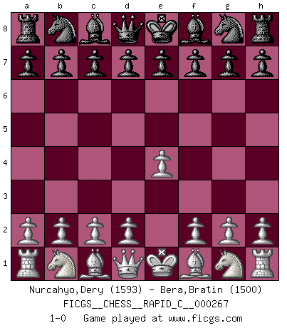 Last move : 1-0 2021 August 22 9:37:33 [Event "FICGS__CHESS__RAPID_C__000267"] [Site "FICGS"] [Date "2021.07.22"] [Round "1"] [White "Nurcahyo,Dery"] [Black "Bera,Bratin"] [Result "1-0"] [WhiteElo "1593"] [BlackElo "1500"] 1.e4 1-0 This chess game has been lost on time (started : 2021.07.22 16:42:47) King's pawn Opening Player White won this chess game. Follow this game move after move (download)The tactician must know what to do whenever something needs doing; the strategist must know what to do when nothing needs doing. (Savielly Tartakover) Schach ist Leben. (Robert James Fischer) La partida mas dura de ganar es una partida ganada. (Emanuel Lasker) Les Echecs mettent en conflit, non pas deux intelligences, mais deux volontés. (Lasker) If we knew what we were doing, we would not call it research. (Albert Einstein)