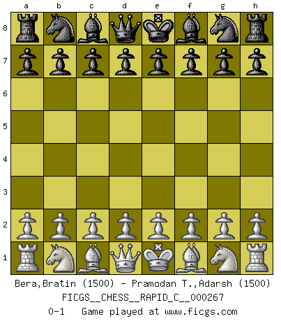 Last move : 0-1 2021 August 21 21:1:57 [Event "FICGS__CHESS__RAPID_C__000267"] [Site "FICGS"] [Date "2021.07.22"] [Round "1"] [White "Bera,Bratin"] [Black "Pramodan T.,Adarsh"] [Result "0-1"] [WhiteElo "1500"] [BlackElo "1500"] 0-1 This chess game has been lost on time (started : 2021.07.22 16:42:47) Player Black won this chess game. Follow this game move after move (download)Play the opening like a book, the middle game like a magician, and the endgame like a machine. (Spielmann) Karpov ist ein Museumsstück. (Garry Kasparov) Solo el jugador con la iniciativa tiene el derecho a atacar. (Wilhelm Steinitz) Si je n'étais pas joueur d'échecs, je serais le meilleur dans quelque chose d'autre. (Anatoli Karpov) We're missing something. (Gregory House, House M.D.)