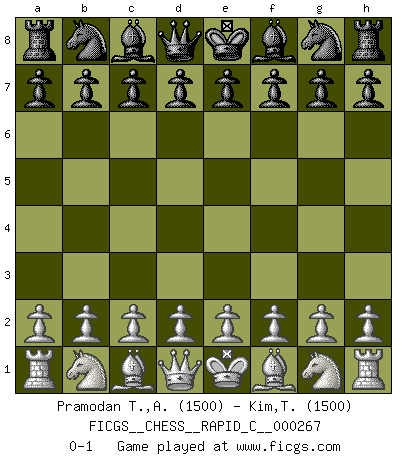 Last move : 0-1 2021 August 21 21:1:57 [Event "FICGS__CHESS__RAPID_C__000267"] [Site "FICGS"] [Date "2021.07.22"] [Round "1"] [White "Pramodan T.,Adarsh"] [Black "Kim,Tinemaexo"] [Result "0-1"] [WhiteElo "1500"] [BlackElo "1500"] 0-1 This chess game has been lost on time (started : 2021.07.22 16:42:47) Player Black won this chess game. Follow this game move after move (download)The winner of the game is the player who makes the next-to-last mistake. (Savielly Tartakover) Es ist im Leben wie im Schachspiel. Wir entwerfen einen Plan, dieser bleibt jedoch bedingt durch das, was im Schachspiel dem Gegner, im Leben dem Schicksal zu tun belieben wird. (Arthur Schopenhauer) No es suficiente ser un buen jugador, se debe también de jugar bién. (Siegbert Tarrasch) Celui qui prend des risques peut perdre, celui qui n'en prend pas perd toujours. (Xavier Tartacover) However beautiful the strategy, you should occasionally look at the results. (Winston Churchill)
