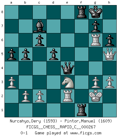 Last move : 0-1 2021 August 31 16:13:57 [Event "FICGS__CHESS__RAPID_C__000267"] [Site "FICGS"] [Date "2021.07.22"] [Round "1"] [White "Nurcahyo,Dery"] [Black "Pintor,Manuel"] [Result "0-1"] [WhiteElo "1593"] [BlackElo "1609"] 1.e4 e5 2.Nc3 Bc5 3.Nf3 Nc6 4.Bc4 d6 5.a3 a5 6.h3 Nf6 7.d3 h6 8.O-O O-O 9.Kh2 Nd4 10.Be3 c6 11.Na4 Ba7 12.Ba2 Nh5 13.Nxd4 exd4 14.Qxh5 dxe3 15.fxe3 Be6 16.d4 Bxa2 17.Rxa2 b5 18.Nc3 Qe7 19.R2a1 Bb8 20.Rf4 d5 21.e5 f6 22.Kh1 fxe5 23.Rg4 exd4 24.exd4 Qd6 25.g3 Rf6 26.Re1 Bc7 27.Nd1 Raf8 28.Kg2 Rf3 29.Re3 Qf6 30.Re2 Rf1 31.Rg6 Qxd4 32.Ne3 Qe4+ 0-1 Vienna game Kingside Castling by player White (move 8) Kingside Castling by player Black (move 8) Player Black won this chess game. Follow this game move after move (download)I have always a slight feeling of pity for the man who has no knowledge of Chess. (Siegbert Tarrasch) Dass jemand wie Surab Asmaiparaschwili, der selbst Elopunkte gekauft hat , Vize-Präsident der Fide werden konnte, sagt schon einges über den Zustand dieser Organisation aus. (Joel Lautier) La señal de un Gran Maestro es su habilidad de ganar una partida rápidamente y sin dolor. (Irving Chernev) L'ordinateur a tué l'originalité. Il n'y a plus guère d'aventures sur l'échiquier. (Jacob Murray) The right perception of any matter and a misunderstanding of the same matter do not wholly exclude each other. (Kafka's the trial)