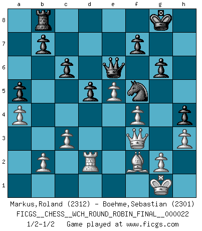 Last move : 1/2-1/2 2021 September 9 11:28:54 [Event "FICGS__CHESS__WCH_ROUND_ROBIN_FINAL__000022"] [Site "FICGS"] [Date "2021.07.27"] [Round "1"] [White "Markus,Roland"] [Black "Boehme,Sebastian"] [Result "1/2-1/2"] [WhiteElo "2312"] [BlackElo "2301"] 1.e4 e5 2.Nf3 Nc6 3.Bb5 Nf6 4.O-O Nxe4 5.Re1 Nd6 6.Nxe5 Be7 7.Bf1 Nxe5 8.Rxe5 O-O 9.d4 Bf6 10.Re1 Re8 11.c3 Rxe1 12.Qxe1 Nf5 13.a4 a5 14.Bf4 g6 15.Nd2 d5 16.h3 c6 17.Nf3 Ng7 18.Bd3 Bf5 19.Bxf5 Nxf5 20.Qd2 Qd7 21.Ne5 Bxe5 22.dxe5 Ng7 23.Bh6 Ne6 24.Rf1 Qe7 25.Be3 Ng7 26.f4 h5 27.Qf2 Qd7 28.Qf3 h4 29.Bb6 Nf5 30.Re1 Rc8 31.Rd1 Qe7 32.Rd2 Qe6 33.Bf2 Rb8 34.Qg4 Qe7 35.Bb6 Rc8 36.Qe2 Qe6 37.Bf2 Re8 38.Qf3 Rb8 1/2-1/2 Ruy Lopez : Berlin defense, Open variation Kingside Castling by player White (move 4) Kingside Castling by player Black (move 8) This chess game ended in a draw. Follow this game move after move (download)Of Chess it has been said that life is not long enough for it, but that is the fault of life, not Chess. (William Ewart Napier) Ich verachte die Medien. (Robert James Fischer) Existen dos clases de sacrificios: los correctos y los míos. (Mikhail Tal) On n'a jamais que l'âge auquel on a commence à jouer aux échecs car après on cesse de vieillir. (Capablanca) Perseverance does not equal worthiness. Next time you want to get my attention, wear something fun. Low-riding jeans are hot. (Gregory House, House M.D.)