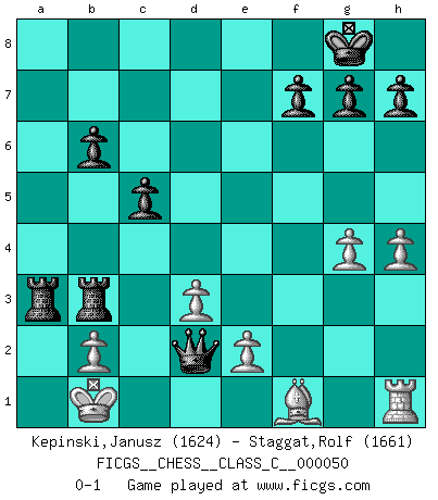 Last move : 0-1 2007 November 30 20:27:10 [Event "FICGS__CHESS__CLASS_C__000050"] [Site "FICGS"] [Date "2007.07.14"] [Round "1"] [White "Kepinski,Janusz"] [Black "Staggat,Rolf"] [Result "0-1"] [WhiteElo "1624"] [BlackElo "1661"] 1.c4 e5 2.f4 exf4 3.Nf3 Be7 4.d3 Bh4+ 5.Kd2 Bf6 6.Nc3 Nh6 7.Nd5 c6 8.Nxf6+ Qxf6 9.Qc2 O-O 10.Qc3 Qe7 11.Kc2 d5 12.Bxf4 Ng4 13.Qd4 Rd8 14.c5 b6 15.cxb6 c5 16.Qa4 Bb7 17.Bc7 Ne3+ 18.Kb1 Rc8 19.Qf4 axb6 20.Bd6 Qe8 21.Be5 d4 22.Qg5 Qf8 23.Bf4 Re8 24.Bxe3 Rxe3 25.a3 Nd7 26.Kc2 Nf6 27.Rc1 Qe8 28.Nd2 Qa4+ 29.Kb1 Bd5 30.h4 Qb5 31.Nc4 Bxc4 32.Rxc4 Rxa3 33.Rxd4 Rb3 34.Rd8+ Ne8 35.Rxe8+ Rxe8 36.Qc1 Ra8 37.g4 R8a3 38.Qc2 Qa5 39.Qd2 Qxd2 0-1 English Opening Kingside Castling by player Black (move 9) Player Black won this chess game. Follow this game move after move (download)Chess is the art which expresses the science of logic. (Mikhail Botvinnik) Ich spiele ehrlich und spiele, um zu gewinnen. Wenn ich verliere nehme ich meine Medizin. (Robert James Fischer) Con o sin el título, Bobby Fischer fue sin lugar a dudas el mas grande jugador de su época. (Burt Hochberg) J'ai vu le vaincu d'Echecs jouer des années durant dans l'espoir de la fête de la victoire. Car tu es plus riche de ce qu'elle existe si même elle n'est point pour toi. Ainsi de la perle du fond des mers. (Antoine de Saint-Exupéry) If only faces could talk... (Pat Summerall, Sportscaster during the Super Bowl)