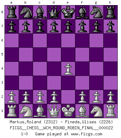 Last move : 1-0 2021 September 4 0:14:51 [Event "FICGS__CHESS__WCH_ROUND_ROBIN_FINAL__000022"] [Site "FICGS"] [Date "2021.07.27"] [Round "1"] [White "Markus,Roland"] [Black "Pineda,Ulises"] [Result "1-0"] [WhiteElo "2312"] [BlackElo "2226"] 1.e4 1-0 This chess game has been lost on time (started : 2021.07.27 10:33:49) King's pawn Opening Player White won this chess game. Follow this game move after move (download)All I want to do, ever, is just play Chess. (Bobby Fischer) Ein typischer, sehr verbreiteter Gedankenschädling ist der, daß der betreffende Amateur von der Annanhme ausgeht, daß jeder einzelne Zug etwas zu leisten habe. (Aaron Nimzowitsch) Desconfianza es la característica mas necesaria de un jugador de Ajedrez. (Siegbert Tarrasch) J'ai vu le vaincu d'Echecs jouer des années durant dans l'espoir de la fête de la victoire. Car tu es plus riche de ce qu'elle existe si même elle n'est point pour toi. Ainsi de la perle du fond des mers. (Antoine de Saint-Exupéry) Unless in communicating with it one says exactly what one means, trouble is bound to result. (Alan Turing, about computers)