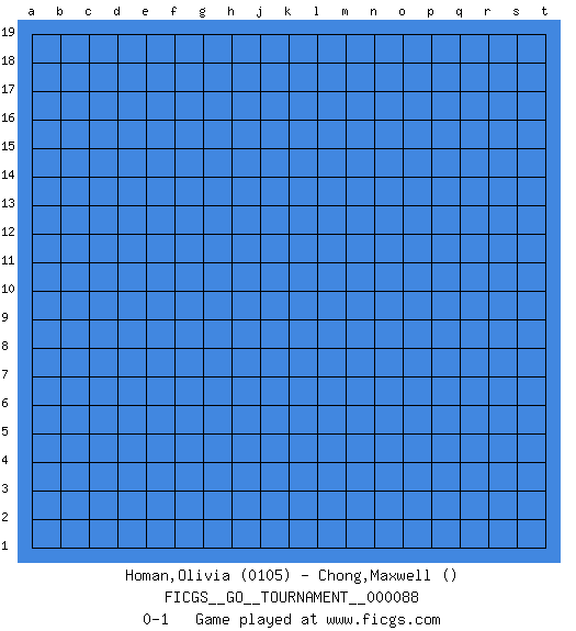 Last move : 0-1 2021 August 26 17:52:13 [Event "FICGS__GO__TOURNAMENT__000088"] [Site "FICGS"] [Date "2021.07.27"] [Round "1"] [Black "Homan,Olivia"] [White "Chong,Maxwell"] [Result "0-1"] [Rating 1 "0105"] 0-1 This go game has been lost on time (started : 2021.07.27 10:39:6) Here are the names of the openings (joseki) played in the four corners : Player White won this Go (weiqi, baduk) game. Follow this game move after move (download)At the head of two stones in a row, play hane. (Anonymous) Wawaweewa ! (Borat: Cultural learnings of America for make benefit glorious nation of Kazakhstan)