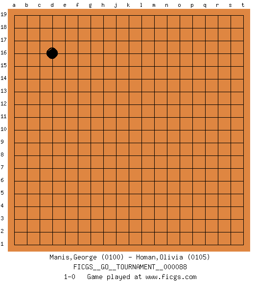 Last move : 1-0 2021 August 31 16:35:38 [Event "FICGS__GO__TOURNAMENT__000088"] [Site "FICGS"] [Date "2021.07.27"] [Round "1"] [Black "Manis,George"] [White "Homan,Olivia"] [Result "1-0"] [Rating 1 "0100"] [Rating 2 "0105"] 1.d16 1-0 This go game has been lost on time (started : 2021.07.27 10:39:6) Here are the names of the openings (joseki) played in the four corners : Player Black won this Go (weiqi, baduk) game. Follow this game move after move (download)Connect with good shape. (Anonymous) Computers are like Old Testament gods; lots of rules and no mercy. (Joseph Campbell)