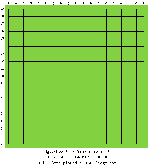 Last move : 0-1 2021 August 26 17:52:13 [Event "FICGS__GO__TOURNAMENT__000088"] [Site "FICGS"] [Date "2021.07.27"] [Round "1"] [Black "Ngo,Khoa"] [White "Sanari,Sora"] [Result "0-1"] 0-1 This go game has been lost on time (started : 2021.07.27 10:39:6) Here are the names of the openings (joseki) played in the four corners : Player White won this Go (weiqi, baduk) game. Follow this game move after move (download)While the Baroque rules of chess could only have been created by humans, the rules of go are so elegant, organic, and rigorously logical that if intelligent life forms exist elsewhere in the universe, they almost certainly play go. (Edward Lasker, international chess master) Good decisions come from experience, and experience comes from bad decisions. (Anonymous)