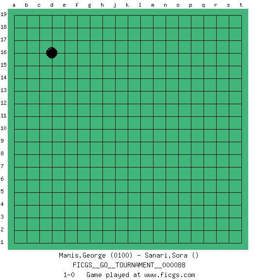 Last move : 1-0 2021 August 31 16:35:38 [Event "FICGS__GO__TOURNAMENT__000088"] [Site "FICGS"] [Date "2021.07.27"] [Round "1"] [Black "Manis,George"] [White "Sanari,Sora"] [Result "1-0"] [Rating 1 "0100"] 1.d16 1-0 This go game has been lost on time (started : 2021.07.27 10:39:6) Here are the names of the openings (joseki) played in the four corners : Player Black won this Go (weiqi, baduk) game. Follow this game move after move (download)Five liberties for tactical stability. (Anonymous) To send light into the darkness of men's hearts - such is the duty of the artist. (Schumann)