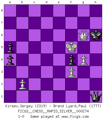 Last move : 1-0 2021 August 3 8:34:11 [Event "FICGS__CHESS__RAPID_SILVER__000274"] [Site "FICGS"] [Date "2021.07.30"] [Round "2"] [White "Kireev,Sergey"] [Black "Brand Lyard,Paul"] [Result "1-0"] [WhiteElo "2319"] [BlackElo "1777"] 1.e4 e5 2.Nf3 Nf6 3.Nxe5 Nxe4 4.Qe2 Qe7 5.Qxe4 d6 6.d4 f5 7.Qf4 Nc6 8.Bb5 Bd7 9.Bxc6 Bxc6 10.O-O dxe5 11.Qxf5 g6 12.Qxe5 Qxe5 13.dxe5 Bg7 14.Nc3 O-O-O 15.Bg5 Rd4 16.Bf6 Bxf6 17.exf6 Rd2 18.Rac1 Rd6 19.Rfe1 Rxf6 20.f3 Rd8 21.Rcd1 Rxd1 22.Rxd1 Bd7 23.Nd5 Ra6 24.a3 c5 25.Kf2 b5 26.h4 Rd6 27.Rd3 c4 28.Rd1 Bf5 29.Ne7+ Kc7 30.Rxd6 Kxd6 31.Nxf5+ gxf5 32.g4 f4 33.Ke2 Kd5 34.Kd2 Ke5 35.Kc3 Kd5 36.h5 a5 37.h6 Ke5 38.a4 bxa4 39.Kxc4 Kf6 40.Kd5 Kg5 41.c4 Kxh6 42.c5 Kg6 43.c6 h5 44.c7 h4 45.Ke6 h3 46.c8Q h2 47.Qg8+ Kh6 48.Kf5 h1Q 49.Qg6+ 1-0 Comment by player 2 : Paul Brand Lyard : a)Beginning d6!best defense? d4....f5! To trap the queen b)Equality material on the end, Lost for one tempo retard! gg Petrov : Damiano variation Kingside Castling by player White (move 10) Queenside Castling by player Black (move 14) 10 pieces endgame at move 41 : White KPPPP , Black KPPPP WHITE : King + 4 Pawns BLACK : King + 4 Pawns Promotion Queen by player White (move 46) Promotion Queen by player Black (move 48) Player White won this chess game. Follow this game move after move (download)Chess mastery essentially consists of analyzing Chess positions accurately. (Mikhail Botvinnik) Es war undenkbar für die Behörden, dass ein sowjetischer Großmeister auf diese Art und Weise [Fischer-Taimanov 6:0] verliert, ohne dass es eine politischer Erklärung dafür gäbe. (Mark Taimanov) Realmente no sabemos como el juego fue inventado, aunque hay sospechas. Tan pronto como descubramos a los culpables, se los haremos saber. (Bruce Pandolfini) La vie est comme un jeu d'échecs : nous esquissons un plan, mais celui-ci est tributaire de ce que daignent faire l'adversaire aux échecs et le destin dans la vie. (Arthur Schopenhauer) Locking firmely the window serves nothing, only small thiefs pass through there, the big thiefs enter through the front door. (Luc-Olivier Leclerc)