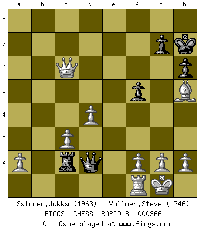 Last move : 1-0 2021 September 18 11:26:18 [Event "FICGS__CHESS__RAPID_B__000366"] [Site "FICGS"] [Date "2021.08.03"] [Round "1"] [White "Salonen,Jukka"] [Black "Vollmer,Steve"] [Result "1-0"] [WhiteElo "1963"] [BlackElo "1746"] 1.d4 Nf6 2.c4 e6 3.Nc3 d5 4.cxd5 exd5 5.Bg5 c6 6.e3 Bd6 7.Bd3 Nbd7 8.Nf3 O-O 9.O-O h6 10.Bh4 Re8 11.Re1 Qa5 12.Qc2 Bb4 13.Nd2 Bxc3 14.bxc3 Qc7 15.e4 dxe4 16.Nxe4 Nxe4 17.Bxe4 Rf8 18.Bh7+ Kh8 19.Bg3 Qd8 20.Bd6 Re8 21.Bc7 Rxe1+ 22.Rxe1 Qf8 23.Bd3 Nf6 24.Be5 Ng4 25.Bd6 Qd8 26.Qb3 Bf5 27.Bxf5 Qxd6 28.Bxg4 Qf4 29.Qxb7 Rb8 30.Qxa7 Rb2 31.Bf3 f5 32.Qa8+ Kh7 33.Qxc6 Qd2 34.Rf1 Rc2 35.Bh5 1-0 Queen's pawn game Kingside Castling by player Black (move 8) Kingside Castling by player White (move 9) Player White won this chess game. Follow this game move after move (download)Every Pawn is a potential Queen. (James Mason) Die westlichen Werte sind eine Sprache, welche die Putin-Administration nicht versteht. (Garry Kasparov) El Ajedrez se juega con la mente... ¡no con las manos!. (Renaud y Kahn) Vouloir jouer aux échecs contre soi-même est aussi paradoxal que vouloir marcher sur son ombre. (Stefan Zweig) Programming can only do so much before it becomes too much. (Don Groves)