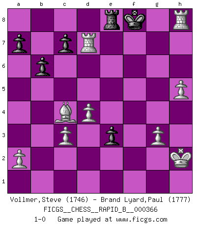 Last move : 1-0 2021 August 5 18:37:9 [Event "FICGS__CHESS__RAPID_B__000366"] [Site "FICGS"] [Date "2021.08.03"] [Round "1"] [White "Vollmer,Steve"] [Black "Brand Lyard,Paul"] [Result "1-0"] [WhiteElo "1746"] [BlackElo "1777"] 1.d4 Nf6 2.c4 e6 3.Nc3 Bb4 4.Nf3 Bxc3+ 5.bxc3 Ne4 6.Qc2 f5 7.g3 O-O 8.Bg2 Nc6 9.O-O d5 10.cxd5 exd5 11.Ba3 Rf7 12.Rab1 b6 13.h4 h5 14.Ng5 Rf6 15.Bc1 Rg6 16.Nxe4 dxe4 17.Bf4 Ba6 18.Kh2 Qf6 19.f3 exf3 20.Bxf3 Qe7 21.Bxh5 Rf6 22.Bg5 Qe4 23.Qxe4 fxe4 24.Bxf6 gxf6 25.Rxf6 Ne7 26.Rbf1 Bxe2 27.Bxe2 Ng6 28.Rxg6+ Kh7 29.h5 e3 30.Rf7+ Kh8 31.Bc4 Re8 32.Rh6+ Kg8 33.Rd7 Kf8 34.Rh8+ 1-0 Nimzo-Indian : Three knights variation Kingside Castling by player Black (move 7) Kingside Castling by player White (move 9) Player White won this chess game. Follow this game move after move (download)You may learn much more from a game you lose than from a game you win. You will have to lose hundreds of games before becoming a good player. (Jose Raul Capablanca) Ich verachte die Medien. (Robert James Fischer) Mis oponentes también hacen buenas movidas. A veces yo no tomo esas cosas en consideración. (Bobby Fischer) Votre prénom est 'Tactique', votre deuxième prénom est 'Tactique' et votre nom est 'Tactique'. (Ken Smith) I teach you to lie, cheat and steal, and as soon as my back's turned you wait in line ? (Gregory House, House M.D.)