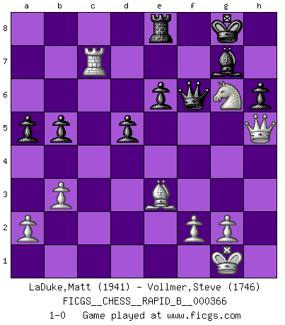 Last move : 1-0 2021 September 18 11:27:25 [Event "FICGS__CHESS__RAPID_B__000366"] [Site "FICGS"] [Date "2021.08.03"] [Round "1"] [White "LaDuke,Matt"] [Black "Vollmer,Steve"] [Result "1-0"] [WhiteElo "1941"] [BlackElo "1746"] 1.e4 c5 2.Nf3 d6 3.Bb5+ Bd7 4.Bxd7+ Qxd7 5.c4 g6 6.d4 cxd4 7.Qxd4 Nf6 8.Nc3 Nc6 9.Qd3 Bg7 10.O-O O-O 11.Bd2 a6 12.Rfd1 Rfd8 13.h3 Rac8 14.Rac1 h6 15.Be3 Qe6 16.Nd5 Nxd5 17.exd5 Nb4 18.Qd2 Nxd5 19.cxd5 Qf6 20.b3 g5 21.Qb4 b5 22.h4 gxh4 23.Nxh4 a5 24.Qg4 Rxc1 25.Rxc1 e6 26.dxe6 fxe6 27.Rc7 d5 28.Ng6 Re8 29.Qh5 1-0 Sicilian : Canal-Sokolsky attack, Sokolsky variation Kingside Castling by player White (move 10) Kingside Castling by player Black (move 10) Player White won this chess game. Follow this game move after move (download)I had a toothache during the first game. In the second game I had a headache. In the third game it was an attack of rheumatism. In the fourth game, I wasn't feeling well. And in the fifth game? Well, must one have to win every game ? (Siegbert Tarrasch) Deine Wertungszahl - vorausgesetzt einige Jahre schachliche Anstrengung - entspricht etwa dem zehnfachen Deines IQ plus 1000. (Jonathan Levitt) El Ajedrez es tan interesante por sí solo, que no es necesario un interés monetario para persuadir a una persona a que lo practique; por lo tanto, nunca se juega por dinero. (Benjamin Franklin) C'est une question de caractère, Beaucoup de gens perdent leur motivation très vite. D'autres, ils sont rares, peuvent la conserver très longtemps. J'aime les échecs, encore aujourd'hui je suis heureux d'analyser des parties. J'aime toujours gagner, je déteste encore perdre. Bien jouer est important pour mon intégrité intellectuelle et morale. Et puis les échecs vivent en ce moment une période historique grâce à Internet. Ils se développent dans les systèmes éducatifs à travers le monde. Ils sortent de leur ghetto, et c'est mon rôle de mener à bien cette révolution. (Gary Kasparov) The arrogant army will lose certainly the battle. (Chinese proverb)