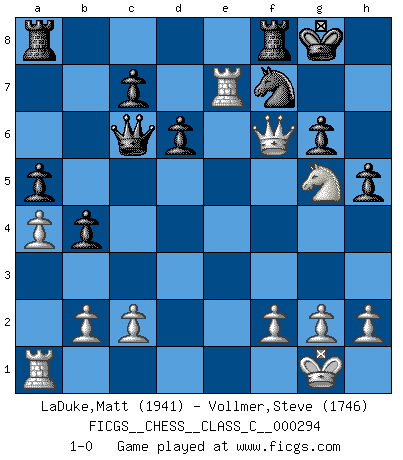 Last move : 1-0 2021 September 5 10:24:13 [Event "FICGS__CHESS__CLASS_C__000294"] [Site "FICGS"] [Date "2021.08.04"] [Round "1"] [White "LaDuke,Matt"] [Black "Vollmer,Steve"] [Result "1-0"] [WhiteElo "1941"] [BlackElo "1746"] 1.e4 e5 2.Nf3 Nc6 3.Bb5 a6 4.Ba4 Nf6 5.O-O b5 6.Bb3 Be7 7.d4 Nxe4 8.dxe5 O-O 9.Bd5 Nc5 10.Nc3 Bb7 11.Re1 Ne6 12.a4 b4 13.Ne2 a5 14.Nf4 Qc8 15.Qd3 Nxf4 16.Bxf4 d6 17.Bg5 Bxg5 18.Nxg5 g6 19.e6 Ne5 20.Qh3 h5 21.exf7+ Nxf7 22.Bxb7 Qxb7 23.Qd3 Nh8 24.Re7 Qc6 25.Qd4 Nf7 26.Qf6 1-0 Ruy Lopez : 5.O-O Kingside Castling by player White (move 5) Kingside Castling by player Black (move 8) Player White won this chess game. Follow this game move after move (download)I'm not a materialistic person, in that, I don't suffer the lack or loss of money. The absence of worldly goods I don't look back on. For Chess is a way I can be as materialistic as I want without having to sell my soul. (Jamie Walter Adams) Modernes Schach erfordert enorme Anspannung. Es ist für einen normalen Menschen unmöglich das auszuhalten. (Viktor Kortschnoi) Me dio la sensación de como si yo estuviera jugando en contra del mismo Ajedrez. - al estar jugando en contra de Robert Fischer (Walter Shipman) Aux échecs, les retours au sommet sont rares : les dommages psychologiques consécutifs à une défaite sont trop sévères. (Daily Telegraph) See no evil, hear no evil, speak no evil. (The 3 monkeys)