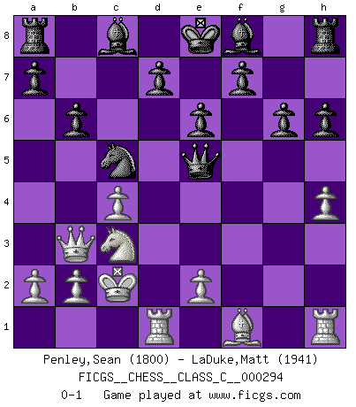 Last move : 0-1 2021 November 4 2:15:34 [Event "FICGS__CHESS__CLASS_C__000294"] [Site "FICGS"] [Date "2021.08.04"] [Round "1"] [White "Penley,Sean"] [Black "LaDuke,Matt"] [Result "0-1"] [WhiteElo "1800"] [BlackElo "1941"] 1.c4 g6 2.d4 Nf6 3.f3 e6 4.Bg5 h6 5.Bh4 c5 6.dxc5 Bxc5 7.g4 Ne4 8.fxe4 Qxh4+ 9.Kd2 Qxg4 10.Nc3 Qg5+ 11.Kc2 Bxg1 12.Qd6 Bc5 13.Qc7 Na6 14.Qa5 b6 15.Qa4 Bf8 16.h4 Qe5 17.Rd1 Nc5 18.Qa3 Nxe4 19.Qb3 Nc5 0-1 This chess game has been lost on time (started : 2021.08.04 11:4:15) English Opening Player Black won this chess game. Follow this game move after move (download)Fischer is under obligation to nobody. (Joseph Platz) Strategie ist, wie man ein Mädchen auf den Rücksitz bekommt. Taktik ist, was man tut, wenn man dann dort ist. (Anonymous) El Ajedrez por encima de todo... ¡es una pelea!. (Emanuel Lasker) RxDa4 pat (...) There is far too much law for those who can afford it and far too little for those who cannot. (Derek Bok)