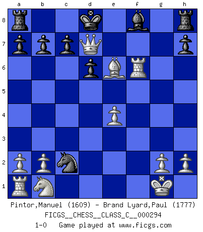 Last move : 1-0 2021 August 6 18:4:49 [Event "FICGS__CHESS__CLASS_C__000294"] [Site "FICGS"] [Date "2021.08.04"] [Round "1"] [White "Pintor,Manuel"] [Black "Brand Lyard,Paul"] [Result "1-0"] [WhiteElo "1609"] [BlackElo "1777"] 1.e4 e5 2.f4 exf4 3.Nf3 g5 4.Bc4 Nc6 5.d4 d6 6.O-O g4 7.Bxf4 gxf3 8.Qxf3 Nxd4 9.Qh5 Qe7 10.Bg5 Nf6 11.Bxf6 Qxf6 12.Rxf6 Be6 13.Bxe6 Nxc2 14.Qxf7+ Kd8 15.Qd7+ 1-0 KGA : Blachly gambit Kingside Castling by player White (move 6) Player White won this chess game. Follow this game move after move (download)Bobby is the finest Chess player this country ever produced. His memory for the moves, his brilliance in dreaming up combinations, and his fierce determination to win are uncanny. (John Collins) Die Auseinandersetzung mit Karpow war politisch geprägt. Er stand für das kommunistische System, wurde von dessen Repräsentanten gehätschelt. Ich war der Oppositionelle. Jeder Schachweltmeister spiegelt auch die gesellschaftlichen Verhältnisse wider. Kramnik steht für die Börsen-Generation des Neuen Markts, ideologiefrei, zahlenfixiert. (Garry Kasparov) En el Ajedrez, cuando menos, el valiente hereda la tierra. (Edmar Mednis) Soyez une menace à chaque fois que vous vous asseyez pour jouer. (Ken Smith) Your best chance to get a Royal Flush in a casino is in the bathroom. (Anonymous)
