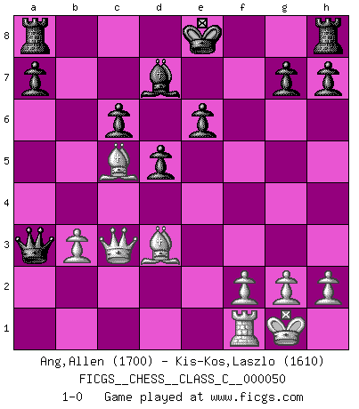 Last move : 1-0 2007 September 4 20:41:8 [Event "FICGS__CHESS__CLASS_C__000050"] [Site "FICGS"] [Date "2007.07.14"] [Round "1"] [White "Ang,Allen"] [Black "Kis-Kos,Laszlo"] [Result "1-0"] [WhiteElo "1700"] [BlackElo "1610"] 1.c4 c5 2.Nf3 Nf6 3.Nc3 Nc6 4.d4 cxd4 5.Nxd4 e6 6.Nxc6 bxc6 7.e4 d5 8.cxd5 exd5 9.Be3 Qa5 10.e5 Ne4 11.Qc2 Bb4 12.Bd3 Nxc3 13.O-O Qa4 14.b3 Qa5 15.a3 Bxa3 16.Rxa3 Qxa3 17.Qxc3 Bd7 18.e6 fxe6 19.Bc5 1-0 English : Symmetrical variation Kingside Castling by player White (move 13) Player White won this chess game. Follow this game move after move (download)Alekhine is a poet who creates a work of art out of something that would hardly inspire another man to send home a picture post card. (Max Euwe) Bobby Fischer ist kein Vorbild für die heutige Jugend. (Viktor Kortschnoi) Ciertamente el estado mental actual de Bobby Fischer es una tragedia. Uno de los mas grandes jugadores de Ajedrez del mundo -el orgullo y pena del Ajedrez Americano. (Frank Brady) La tactique est l'élément le plus important du milieu de jeu. (Siegbert Tarrasch) Do you know these so called Volunteers don't even get paid! (Simpsons)
