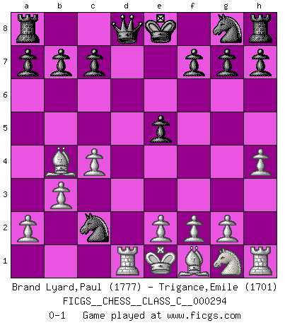 Last move : 0-1 2021 August 5 18:20:8 [Event "FICGS__CHESS__CLASS_C__000294"] [Site "FICGS"] [Date "2021.08.04"] [Round "1"] [White "Brand Lyard,Paul"] [Black "Trigance,Emile"] [Result "0-1"] [WhiteElo "1777"] [BlackElo "1701"] 1.Na3 e5 2.Nc4 Nc6 3.d3 d5 4.Ne3 Be6 5.h4 d4 6.Nc4 Bxc4 7.dxc4 Bb4+ 8.c3 dxc3 9.b3 c2 10.Bd2 cxd1Q+ 11.Rxd1 Nd4 12.Bxb4 Nc2+ 0-1 Durkin's attack Promotion Queen by player Black (move 10) Player Black won this chess game. Follow this game move after move (download)A thorough understanding of the typical mating continuations makes the most complicated sacrificial combinations leading up to them not only not difficult, but almost a matter of course. (Siegbert Tarrasch) Bogoljubow: Matt in vier Zügen! Tartakower: Ich verbitte mir jede Belästigung! (Savielly Grigorievitsch Tartakower) Un jugador que trata de regresar una movida en el Ajedrez es un futuro carterista. (Richard Fenton) On peut tirer plus d'utilité d'une partie perdue que de 100 parties gagnées. (Capablanca) The question of whether computers can think is just like question of whether submarines can swim. (Edsger W. Dijkstra)