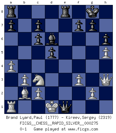 Last move : 0-1 2021 August 6 15:8:16 [Event "FICGS__CHESS__RAPID_SILVER__000275"] [Site "FICGS"] [Date "2021.08.05"] [Round "1"] [White "Brand Lyard,Paul"] [Black "Kireev,Sergey"] [Result "0-1"] [WhiteElo "1777"] [BlackElo "2319"] 1.a4 e5 2.h4 d5 3.e3 Nc6 4.Bb5 Nf6 5.Bxc6+ bxc6 6.b3 Bd6 7.Bb2 O-O 8.h5 h6 9.Nf3 Bg4 10.Nc3 e4 11.Rh4 exf3 12.Rxg4 Nxg4 13.Qxf3 Qg5 14.Qh3 Rfe8 15.f3 Nxe3 16.dxe3 Qxe3+ 17.Kd1 Qe1+ 0-1 Crab Opening Kingside Castling by player Black (move 7) Player Black won this chess game. Follow this game move after move (download)It began to feel as though you were playing against Chess itself. - On playing against Robert Fischer. (Walter Shipman) Das Zentrum ist der Balkan des Schachbretts - Kriegshandlungen können in jedem Moment ausbrechen. (Aaron Nimzowitsch) Aún el Rey más flojo huye despavorido ante la amenaza de un Jaque doble. (Aaron Nimzowitsch) Il s'avisa de me proposer d'apprendre les échecs qu'il jouait un peu... me voilà forcené des échecs. J'achète un échiquier, je m'enferme dans ma chambre, j'y passe des jours et des nuits à vouloir apprendre par cœur toutes les parties. (Jean-Jacques Rousseau, Confessions) Empty your mind, be formless, shapeless — like water. (Bruce Lee)
