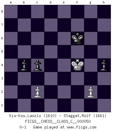 Last move : 0-1 2008 April 6 14:38:1 [Event "FICGS__CHESS__CLASS_C__000050"] [Site "FICGS"] [Date "2007.07.14"] [Round "1"] [White "Kis-Kos,Laszlo"] [Black "Staggat,Rolf"] [Result "0-1"] [WhiteElo "1610"] [BlackElo "1661"] 1.e4 e5 2.Nf3 Nc6 3.Bb5 Nf6 4.O-O Nxe4 5.d4 Nd6 6.Bxc6 dxc6 7.dxe5 Nf5 8.Qxd8+ Kxd8 9.Nc3 Bd7 10.b3 Kc8 11.Bb2 Be7 12.Rad1 a5 13.Rd3 Nh4 14.Nxh4 Bxh4 15.Ba3 a4 16.bxa4 Bf5 17.Rd4 Bd8 18.Rd2 f6 19.f4 fxe5 20.fxe5 Bg5 21.Re2 Be6 22.Re4 b6 23.h4 Bd2 24.Bb2 h5 25.Nb1 Bh6 26.Bc1 Bxc1 27.Rxc1 Bxa2 28.Nd2 Bd5 29.Rf4 Kd7 30.Re1 c5 31.Ne4 Bxe4 32.Rfxe4 Ke6 33.R1e3 Rhd8 34.Rg3 Rd1+ 35.Kf2 Rd2+ 36.Re2 Rxe2+ 37.Kxe2 Rxa4 38.Rxg7 Rxh4 39.Rxc7 Kxe5 40.Rc6 Re4+ 41.Kf3 Rf4+ 42.Ke2 Rf6 43.Rxf6 Kxf6 44.Ke3 b5 45.Kf4 h4 46.Kg4 b4 47.Kf4 c4 0-1 Ruy Lopez : Berlin defense, Open variation Kingside Castling by player White (move 4) 10 pieces endgame at move 39 : White KRPPP , Black KRPPP WHITE : King + 1 Rook 3 Pawns BLACK : King + 1 Rook 3 Pawns 9 pieces endgame at move 39 : White KRPP , Black KRPPP WHITE : King + 1 Rook 2 Pawns BLACK : King + 1 Rook 3 Pawns 8 pieces endgame at move 43 : White KRPP , Black KPPP WHITE : King + 1 Rook 2 Pawns BLACK : King + 3 Pawns 7 pieces endgame at move 43 : White KPP , Black KPPP WHITE : King + 2 Pawns BLACK : King + 3 Pawns Player Black won this chess game. Follow this game move after move (download)Only the player with the initiative has the right to attack. (Wilhelm Steinitz) Schach verlangt totale Konzentration. (Robert James Fischer) ¿Se han dado cuenta de que Fischer casi nunca ha tenido piezas malas? El las intercambia y las piezas malas se quedan con sus oponenets. (Yuri Balashov) Ne tendez aucun piège pour le plaisir ! Ne jouez rien dans l'espoir que l'adversaire réagisse de façon stupide ! Prenez toujours pour acquis que l'adversaire va trouver le meilleur coup ! Ne jouez jamais de coup dans l'espoir que l'adversaire ne voie pas la menace ! Chacun de vos coups doit améliorer la position d'une façon ou d'une autre. Experience is the name we all give to our mistakes. (Oscar Wilde)