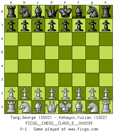 Last move : 0-1 2021 September 14 12:41:41 [Event "FICGS__CHESS__CLASS_E__000239"] [Site "FICGS"] [Date "2021.08.05"] [Round "1"] [White "Tang,George"] [Black "Kehayov,Yulian"] [Result "0-1"] [WhiteElo "1502"] [BlackElo "1322"] 0-1 This chess game has been lost on time (started : 2021.08.05 9:46:52) Player Black won this chess game. Follow this game move after move (download)The beauty of a move lies not in its' appearance but in the thought behind it. (Siegbert Tarrasch) Bobby Fischer ist kein Vorbild für die heutige Jugend. (Viktor Kortschnoi) El Ajedrez demanda una total concentración. (Bobby Fischer) Tout change constamment, y compris dans le monde des Echecs. (Botvinnik) If everyone is thinking alike, then somebody isn't thinking. (US General George S. Patton)