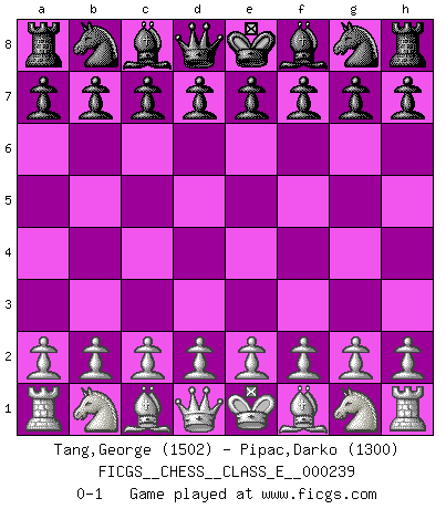 Last move : 0-1 2021 September 14 12:41:41 [Event "FICGS__CHESS__CLASS_E__000239"] [Site "FICGS"] [Date "2021.08.05"] [Round "1"] [White "Tang,George"] [Black "Pipac,Darko"] [Result "0-1"] [WhiteElo "1502"] [BlackElo "1300"] 0-1 This chess game has been lost on time (started : 2021.08.05 9:46:52) Player Black won this chess game. Follow this game move after move (download)Every Pawn is a potential Queen. (James Mason) Der Traum, für den ich lebe, ist der von einem freien Russland. Viele mögen sagen: Russland hat doch ein Parlament, einen gewählten Präsidenten. Aber ich spüre, dass in meiner Heimat die Angst wiederkehrt. Eine Angst, sich frei zu äußern, bestimmte Dinge zu tun (Garry Kasparov) Es el objetivo de la escuela moderna no tratar cada posición de acuerdo a una regla general, sino de acuerdo al principio inherente en la posición. (Richard Reti) C'est la seule position que je connaisse où les deux camps sont mals. Propos prêtés à V. Anand. All the biggest technological inventions created by man - the airplane, the automobile, the computer - says little about his intelligence, but speaks volumes about his laziness. (Mark Kennedy)