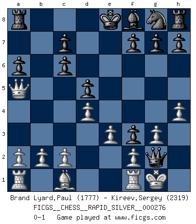 Last move : 0-1 2021 August 6 21:7:8 [Event "FICGS__CHESS__RAPID_SILVER__000276"] [Site "FICGS"] [Date "2021.08.05"] [Round "1"] [White "Brand Lyard,Paul"] [Black "Kireev,Sergey"] [Result "0-1"] [WhiteElo "1777"] [BlackElo "2319"] 1.Nh3 d5 2.Ng1 e5 3.e3 Nc6 4.Bb5 Qg5 5.g3 a6 6.Bxc6+ bxc6 7.Nf3 Qh5 8.O-O Bg4 9.h4 Bxf3 10.Qe1 e4 11.d4 Qg4 12.Nd2 Qh3 13.Nxf3 exf3 14.Qa5 Qg2+ 0-1 Amar (Paris) Opening Kingside Castling by player White (move 8) Player Black won this chess game. Follow this game move after move (download)A big shock; the best chess player in history has passed away. (Lajos Portisch, about Bobby Fischer's death) Mein Gehirn das ist mein zweitwichtigstes Organ [Aus dem Film: Der Schläfer]. (Woody Allen) Si tu oponente no puede hacer nada activo, entonces no apures la posición; En vez de eso, dejalo estar sentado ahí, sufriendo y rogandote por un empate. (Jeremy Silman) Les échecs, c'est la lutte contre l'erreur. (Johannes Zukertort) Shallow men believe in luck. Strong men belive in cause and effect. (Ralph Waldo Emerson)
