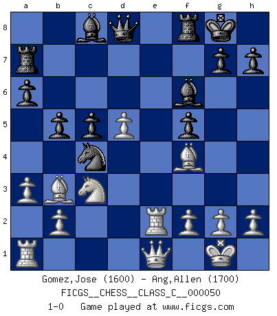 Last move : 1-0 2007 November 13 7:10:34 [Event "FICGS__CHESS__CLASS_C__000050"] [Site "FICGS"] [Date "2007.07.14"] [Round "1"] [White "Gomez,Jose"] [Black "Ang,Allen"] [Result "1-0"] [WhiteElo "1600"] [BlackElo "1700"] 1.d4 d5 2.c4 dxc4 3.e3 e6 4.Bxc4 Nf6 5.Nf3 a6 6.O-O c5 7.Bb3 Nbd7 8.e4 Nxe4 9.Re1 Nd6 10.d5 e5 11.Nxe5 Nxe5 12.Rxe5+ Be7 13.Qe1 Ra7 14.Bf4 b6 15.Ba4+ b5 16.Bc2 O-O 17.Nc3 f5 18.Re2 Bf6 19.a3 Nc4 20.Bb3 1-0 This chess game has been lost on time (started : 2007.07.14 16:38:59) Queen's gambit accepted Kingside Castling by player White (move 6) Kingside Castling by player Black (move 16) Player White won this chess game. Follow this game move after move (download)I love all positions. Give me a difficult positional game, I will play it. But totally won positions, I cannot stand them. (Hein Donner) Es ist schade, dass viele Schachsportler vergessen, wie wichtig Auftreten und angemessene Kleidung sind. (Alexandra Kosteniuk) El Ajedrez es tan inspirador que yo no creo que un buen jugador sea capaz de tener un pensamiento malo durante una partida. (Wilhelm Steinitz) Le temps de noter son nom sur la feuille de partie, j'étais déjà en zeitnot ! D'un modeste amateur apparié lors de la première ronde d'un open contre le grand-maître Azmaïparashvili. After growing wildly for years, the field of computing appears to be reaching its infancy. (John Pierce)