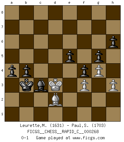 Last move : 0-1 2021 August 17 8:55:22 [Event "FICGS__CHESS__RAPID_C__000268"] [Site "FICGS"] [Date "2021.08.05"] [Round "1"] [White "Leurette,Marc-Antoine"] [Black "Paul,Samagata"] [Result "0-1"] [WhiteElo "1631"] [BlackElo "1703"] 1.e4 e5 2.Nf3 d6 3.Nc3 Nf6 4.Bc4 h6 5.d4 exd4 6.Nxd4 Bd7 7.O-O Be7 8.Re1 O-O 9.b3 Nc6 10.e5 dxe5 11.Nxc6 Bxc6 12.Qxd8 Raxd8 13.Be3 a6 14.Rad1 Rxd1 15.Rxd1 Rd8 16.Rxd8+ Bxd8 17.f3 Be7 18.Ne2 b5 19.Bd3 Bd7 20.c4 c6 21.Ng3 Bb4 22.Ne4 Nxe4 23.Bxe4 f5 24.Bd3 g5 25.h3 Kg7 26.g4 f4 27.Bc1 Bc3 28.cxb5 cxb5 29.Ba3 b4 30.Bc1 a5 31.Bc4 Kf6 32.Kf2 Ke7 33.Ke2 Kd6 34.a4 Kc5 35.Kd3 Ba1 36.Ke4 Bc3 37.Kd3 Bc6 38.Ke2 Bxa4 39.bxa4 Kxc4 40.Kd1 Kb3 41.Ke2 Kxa4 42.Kd3 Kb3 43.Bd2 a4 0-1 Philidor's defense Kingside Castling by player White (move 7) Kingside Castling by player Black (move 8) Player Black won this chess game. Follow this game move after move (download)You can only get good at Chess if you love the game. (Bobby Fischer) Man braucht nicht immer den besten Zug zu spielen: Ein Zug muß aktiv, unternehmungslustig, korrekt und schön sein. (David Bronstein) Fischer no está bajo la obligación de nadie. (Joseph Platz) Les échecs sont un jeu terrible. Si vous n'avez pas le centre, votre adversaire a une position plus libre. Par contre, si vous avez le centre, alors vous avez vraiment quelque chose pour laquelle vous inquiéter ! (Siegbert Tarrasch) There is far too much law for those who can afford it and far too little for those who cannot. (Derek Bok)
