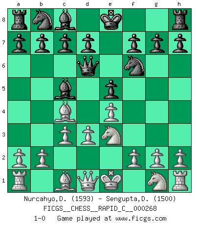 Last move : 1-0 2021 September 16 14:12:3 [Event "FICGS__CHESS__RAPID_C__000268"] [Site "FICGS"] [Date "2021.08.05"] [Round "1"] [White "Nurcahyo,Dery"] [Black "Sengupta,Debashish"] [Result "1-0"] [WhiteElo "1593"] [BlackElo "1500"] 1.e4 e5 2.Nc3 Bb4 3.Bc4 Qe7 4.Nd5 Qd6 5.c3 Bc5 6.d3 Nf6 7.Ne3 1-0 This chess game has been lost on time (started : 2021.08.05 18:22:3) Vienna game Player White won this chess game. Follow this game move after move (download)Bobby Fischer's current state of mind is indeed a tragedy. One of the world's greatest Chess players - the pride and sorrow of American Chess. (Frank Brady) Ein bischen Romantik kann weder im Schach noch in der Liebe schaden. Also versuche ich mich ab und zu daran zu erinnern. (Nigel Short) No es una movida, aún la mejor movida que tu debas buscar, sino un plan comprensible. (Eugene Znosko-Borovsky) Mon pion favori sur ma case favorite ! Bronstein en parlant d'un coup de pion en h5 quand il avait les Noirs. The Internet is the first thing that humanity has build that humanity doesn't understand, the largest experiment in anarchy that we have ever had. (Eric Schmidt)