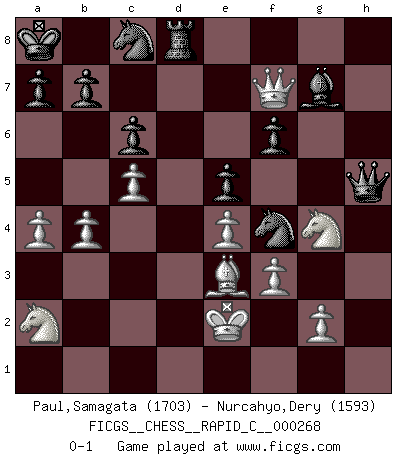 Last move : 0-1 2021 September 14 12:30:42 [Event "FICGS__CHESS__RAPID_C__000268"] [Site "FICGS"] [Date "2021.08.05"] [Round "1"] [White "Paul,Samagata"] [Black "Nurcahyo,Dery"] [Result "0-1"] [WhiteElo "1703"] [BlackElo "1593"] 1.e4 h5 2.d4 c6 3.Nf3 d6 4.Bd3 Nf6 5.Nc3 Nbd7 6.O-O Nb6 7.a3 Bd7 8.Be3 Qc7 9.Rc1 Ng4 10.Bd2 O-O-O 11.h3 Nf6 12.b3 Kb8 13.Bf4 Ka8 14.Qd2 Ng8 15.Rfe1 f6 16.Na2 e5 17.Be3 Ne7 18.c4 Ng6 19.c5 dxc5 20.dxc5 Nc8 21.Qc3 Be6 22.Bc4 Bg8 23.Red1 Rxd1+ 24.Rxd1 Nge7 25.a4 g5 26.b4 g4 27.hxg4 hxg4 28.Nh2 Ng6 29.Nxg4 Qh7 30.Kf1 Qh1+ 31.Ke2 Qh5 32.f3 Bg7 33.Rd8 Bxc4+ 34.Qxc4 Rxd8 35.Qf7 Nf4+ 0-1 King's pawn Opening Kingside Castling by player White (move 6) Queenside Castling by player Black (move 10) Player Black won this chess game. Follow this game move after move (download)Suddenly it was obvious to me in my analysis I had missed what Fischer had found with the greatest of ease at the board. (Mikhail Botvinnik) Kombinieren und Schwarzhandel gehören verboten. (Savielly Grigorievitsch Tartakower) Las piezas de Ajedrez son los bloques del alfabeto que moldean los pensamientos; y esos pensamientos, aunque hagan un diseño visual en el tablero, expresan abstractamente su belleza como un poema. (Marcel Duchamp) Les pièces de l'échiquier étaient impitoyables. Elles le retenaient, elles l'absorbaient. Il y avait de l'horreur en cela, mais aussi une harmonie unique. Car, qu'y a-t-il dans le monde, à part les échecs ? (V. Nabokov) Perhaps the current trend of many chess professionals taking up the more lucrative pastime of poker is not a wholly negative one. It may not be too late for humans to relearn how to take risks in order to innovate and thereby maintain the advanced lifestyles we enjoy. And if it takes a poker-playing supercomputer to remind us that we can't enjoy the rewards without taking the risks, so be it. (The Chess Master and the Computer, by Garry Kasparov - 2010)