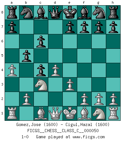 Last move : 1-0 2007 August 23 23:16:15 [Event "FICGS__CHESS__CLASS_C__000050"] [Site "FICGS"] [Date "2007.07.14"] [Round "1"] [White "Gomez,Jose"] [Black "Cigul,Hazal"] [Result "1-0"] [WhiteElo "1600"] [BlackElo "1600"] 1.d4 d5 2.c4 c6 3.Nc3 dxc4 4.e3 b5 5.a4 1-0 This chess game has been lost on time (started : 2007.07.14 16:38:59) QGD Slav defense Player White won this chess game. Follow this game move after move (download)A man without frontiers. He didn't divide the East and the West, he brought them together in their admiration for him. (Ljubomir Ljubojevic, about Bobby Fischer's death) Privat ist Kortschnoi kein schlechter Mensch, sehr sympathisch. Aber während des Spiels ist er grausam. Er will dich töten. (Miguel Najdorf) El tablero es el mundo, las piezas es el fenomeno del universo, las reglas del juego son lo que llamamos leyes de la naturaleza y el jugador del lado opuesto, se encuentra oculto a nuestra vista. (Thomas Huxley) J'ai toujours senti une vague pitié pour l'homme qui ne connaît rien aux échecs, tout comme j'en aurais pour un homme ignorant de l'amour. Les Echecs, comme la musique ou comme l'amour, ont le pouvoir de rendre heureux. (Siegbert Tarrasch) Every now and then a man's mind is stretched by a new idea and never shrinks back to its former dimensions. (Oliver Wendell Holmes, Sr.)