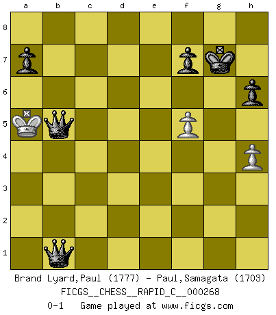 Last move : 0-1 2021 August 11 11:13:53 [Event "FICGS__CHESS__RAPID_C__000268"] [Site "FICGS"] [Date "2021.08.05"] [Round "1"] [White "Brand Lyard,Paul"] [Black "Paul,Samagata"] [Result "0-1"] [WhiteElo "1777"] [BlackElo "1703"] 1.e4 Nc6 2.Bb5 d5 3.Bxc6+ bxc6 4.d3 e6 5.Nf3 Bd6 6.O-O Bb7 7.Nc3 c5 8.exd5 exd5 9.Nb5 Be7 10.Ne5 Nf6 11.Bg5 h6 12.Bxf6 Bxf6 13.Qe2 O-O 14.f4 Re8 15.d4 cxd4 16.Nxd4 c5 17.Nf5 Qc7 18.Qh5 Bxe5 19.fxe5 Rxe5 20.g4 c4 21.Rae1 Rae8 22.Nxg7 Kxg7 23.Rxe5 Rxe5 24.Rf5 Rxf5 25.gxf5 Qb6+ 26.Kg2 d4 27.Kf2 d3 28.Ke1 Qe3+ 29.Kd1 Bf3+ 30.Qxf3 Qxf3+ 31.Kd2 Qe2+ 32.Kc3 Qxc2+ 33.Kb4 d2 34.a4 d1Q 35.Kc5 Qc2xa4 36.b3 Qa4xb3 37.h4 Qb6+ 38.Kxc4 Qc6+ 39.Kb4 Qb1+ 40.Ka5 Qc6b5+ 0-1 KP : Nimzovich defense Kingside Castling by player White (move 6) Kingside Castling by player Black (move 13) Promotion Queen by player Black (move 34) 10 pieces endgame at move 36 : White KPP , Black KQQPPPP WHITE : King + 2 Pawns BLACK : King + 2 Queens 4 Pawns 9 pieces endgame at move 38 : White KPP , Black KQQPPP WHITE : King + 2 Pawns BLACK : King + 2 Queens 3 Pawns Player Black won this chess game. Follow this game move after move (download)Chess opens and enriches your mind. (Saudin Robovic) Am wohlsten fühle ich mich, wenn ich sehe, wie sich mein Gegner im Todeskampf windet. (Robert James Fischer) Personalmente, yo prefiero mirar hacia el futuro en donde un programa de computadora gane el título mundial de Ajedrez. La humanidad necesita una lección de humildad. (Richard Dawkings) Je ne crois pas en la psychologie, je crois aux bons coups. (Robert Fischer) We need strong personalities and only one world champion to attract sponsors. (Anatoly Karpov)