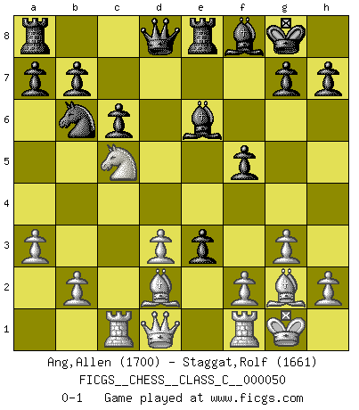 Last move : 0-1 2007 November 21 19:31:16 [Event "FICGS__CHESS__CLASS_C__000050"] [Site "FICGS"] [Date "2007.07.14"] [Round "1"] [White "Ang,Allen"] [Black "Staggat,Rolf"] [Result "0-1"] [WhiteElo "1700"] [BlackElo "1661"] 1.c4 e5 2.g3 Nf6 3.Bg2 d5 4.cxd5 Nxd5 5.Nc3 Nb6 6.d3 Be7 7.Nf3 Nc6 8.O-O O-O 9.Be3 Re8 10.a3 Bf8 11.Ne4 Nd4 12.Rc1 c6 13.Nxd4 exd4 14.Bd2 Be6 15.e3 f5 16.Nc5 dxe3 0-1 This chess game has been lost on time (started : 2007.07.14 16:38:59) English Opening Kingside Castling by player White (move 8) Kingside Castling by player Black (move 8) Player Black won this chess game. Follow this game move after move (download)There is no remorse like the remorse of Chess. (H. G. Wells) Das Schachspiel ist ein See, in welchem eine Mücke baden und ein Elefant ertrinken kann. (Emanuel Lasker) Solo los afeminados hacen el Enroque. (Rob Sillars) Il n'y a pas de prix trop élevé au scalp de l'ennemi. (Koblentz) When you have everything, sometimes it feels like nothing. (Horatio Caine, C.S.I. Miami)