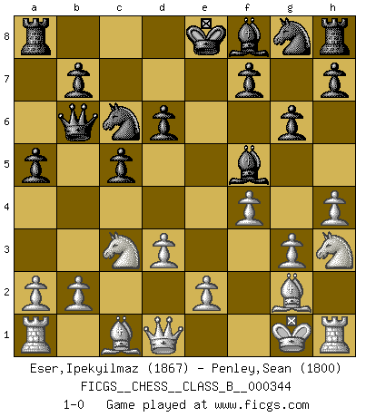 Last move : 1-0 2021 November 15 21:18:38 [Event "FICGS__CHESS__CLASS_B__000344"] [Site "FICGS"] [Date "2021.08.05"] [Round "1"] [White "Eser,Ipekyilmaz"] [Black "Penley,Sean"] [Result "1-0"] [WhiteElo "1867"] [BlackElo "1800"] 1.g3 e5 2.Bg2 c5 3.h3 d6 4.h4 a5 5.Nh3 g6 6.Kf1 Nc6 7.Kg1 Bg4 8.f3 Bf5 9.f4 e4 10.d3 exd3 11.cxd3 Qb6 12.Nc3 1-0 This chess game has been lost on time (started : 2021.08.05 18:23:11) Benko's Opening Player White won this chess game. Follow this game move after move (download)Chess is a cold bath for the mind. (Sir John Simon) Rubinstein ist ein Turmendspiel, welches die Götter vor tausenden von Jahren begannen. (Savielly Grigorievitsch Tartakower) Yo creo que el Ajedrez posee una magia que es también una ayuda en la edad avanzada. Una rodilla reumática es olvidada durante una partida de Ajedrez y otros eventos pueden parecer algo sin importancia comparada a una catástrofe en el tablero de Ajedrez. (Vlastimil Hort) Ce qui est bien, c'est d'avoir tout un tas de pièces en prise : l'adversaire ne peut en prendre qu'une à la fois. Cité par Thierry Audin. Computers have lots of memory but no imagination. (Anonymous)